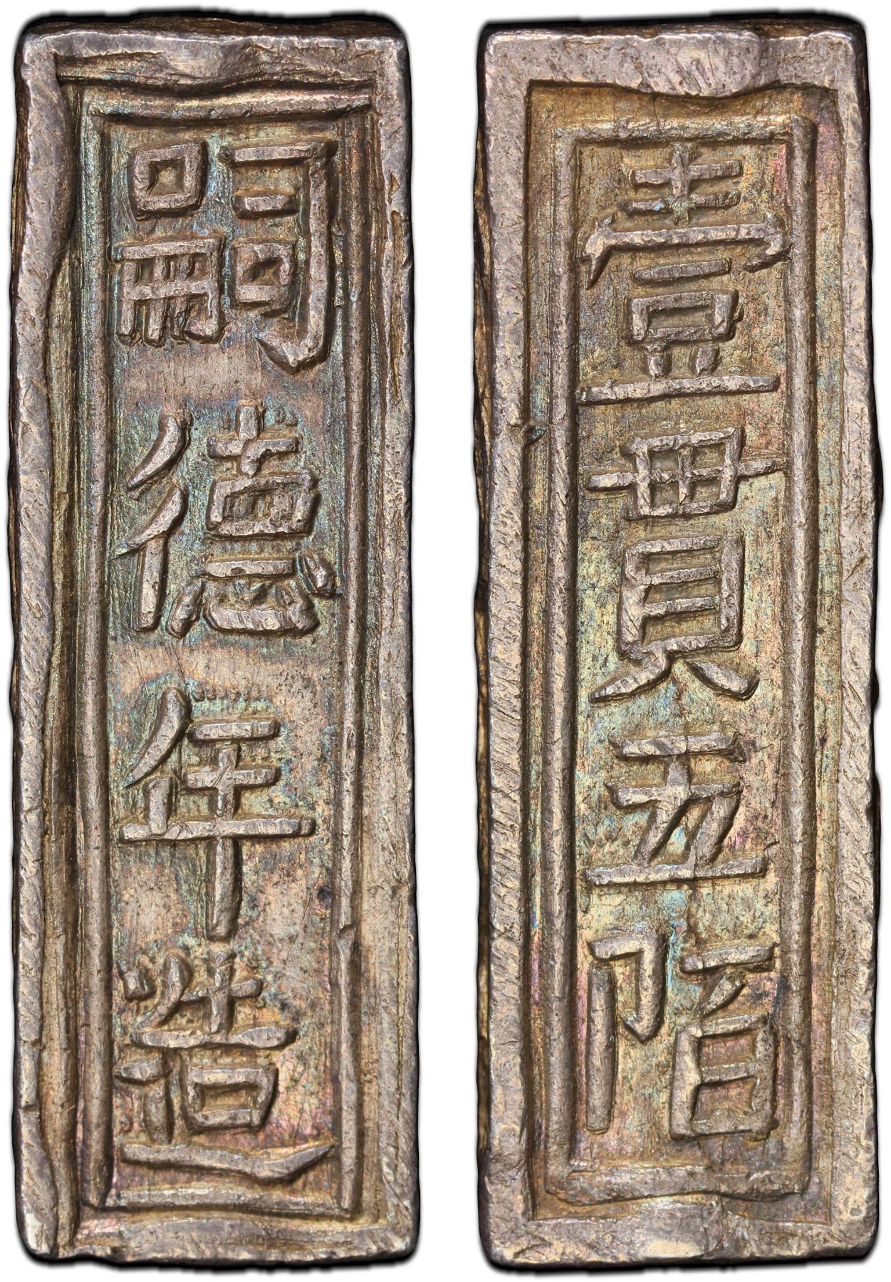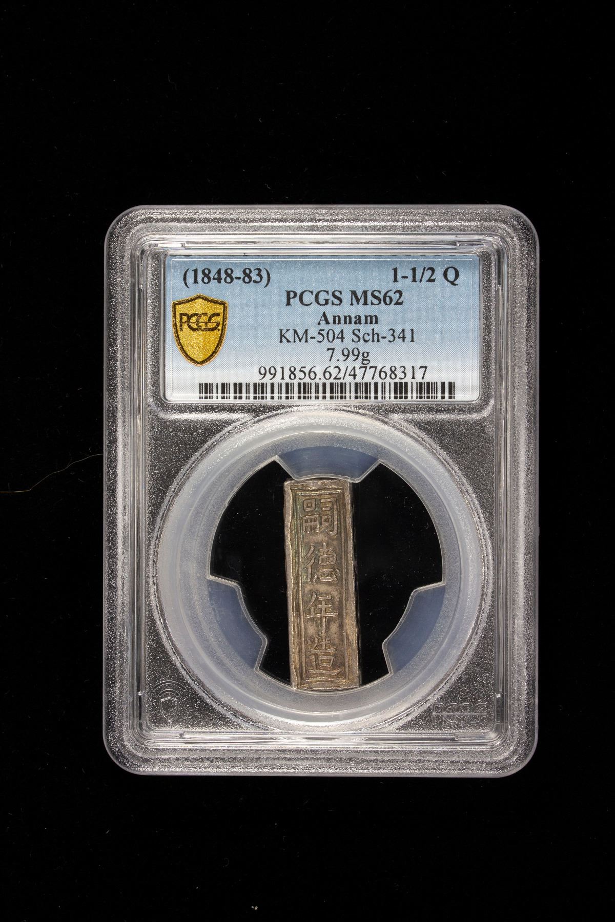NGUYEN DYNASTY (DAI NAM): Tu Duc, 1848-1883, AR 1½ tien (7.99g), KM-504, Sch-341, silver quan currency bar, tu duc nien tao (Made in the Tu Duc era) // nhat quan ngu mach (value five tenths), floral designs on the edge, an attractive mint state example, PCGS graded MS62.