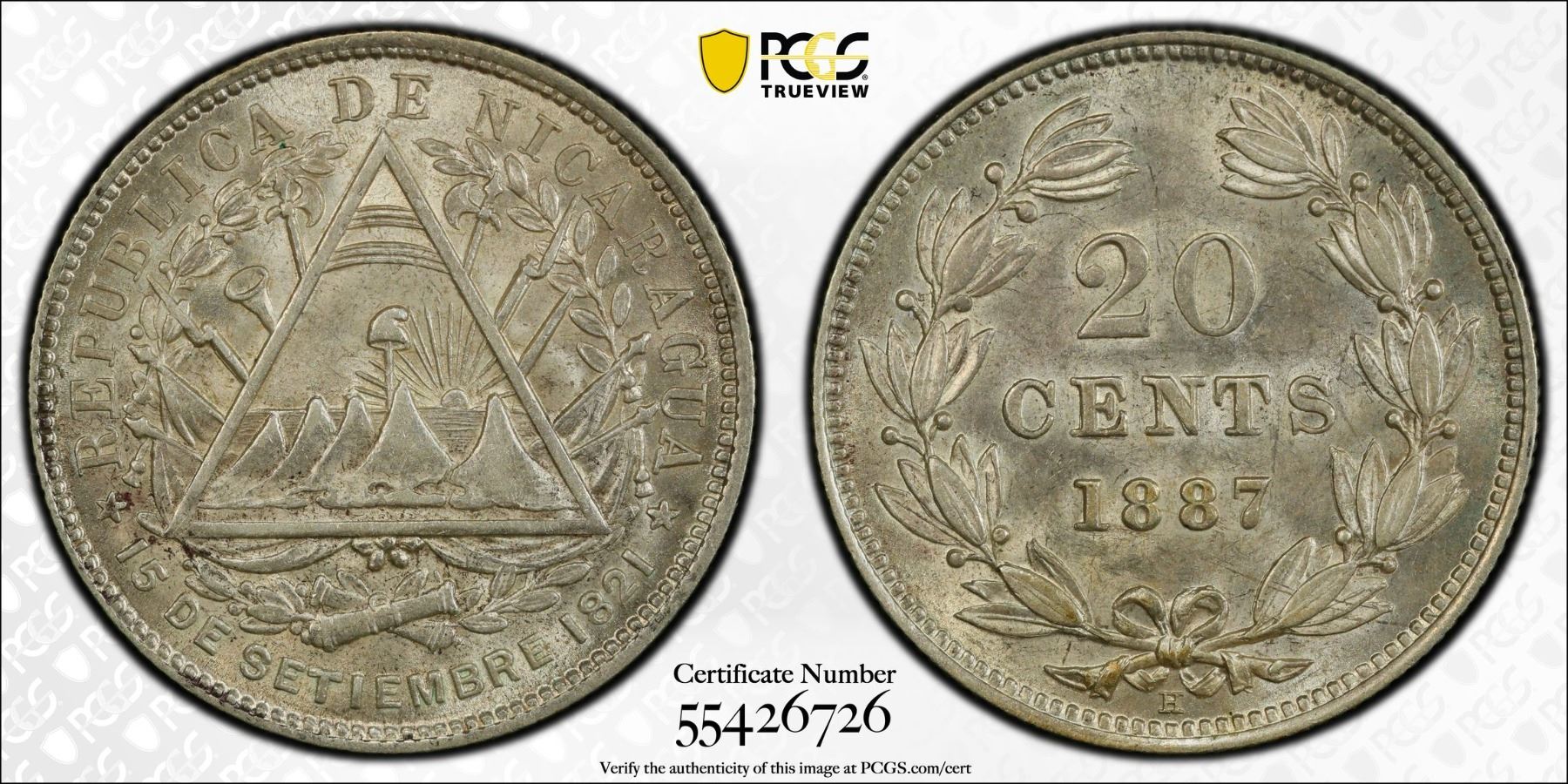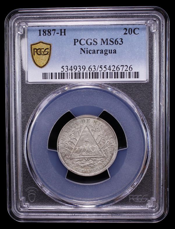 NICARAGUA: Republic, AR 20 centavos, 1887-H, PCGS MS63