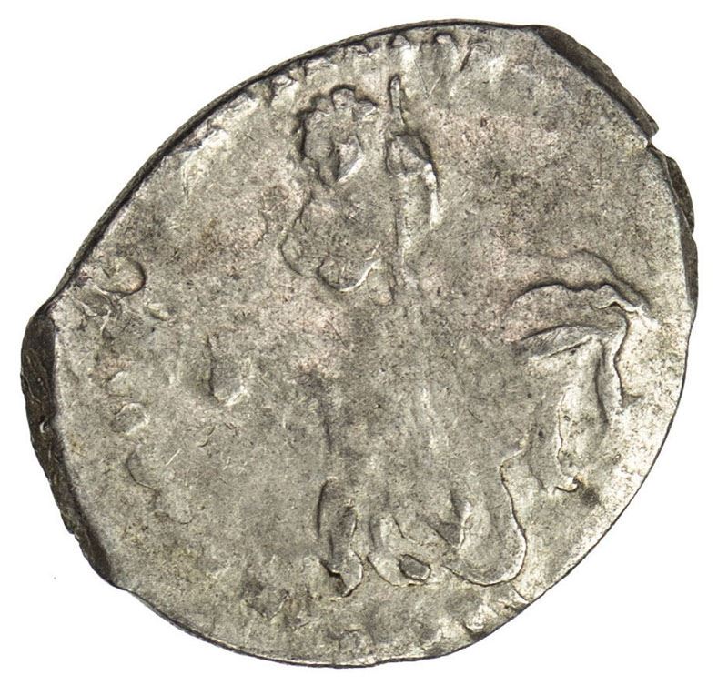 NIZHNY NOVGOROD: Vasiliy Dmitrievich, 1389-1425, AR denga (0.47g), H&P-1955, St. George slaying dragon / Russian legend, partly weak strike, VF.
