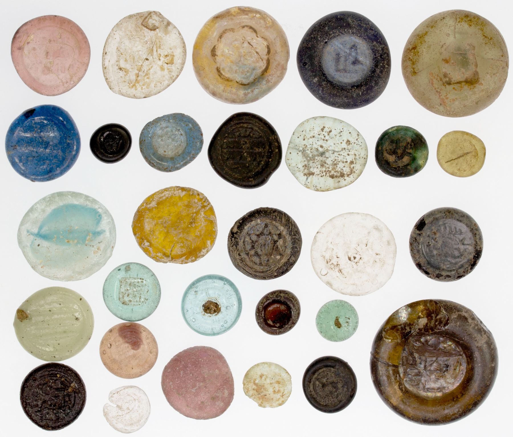 NON-FATIMID: COLLECTION of 28 glass weights (jetons), mostly unidentified, mostly Ayyubid and Mamluk or very early Ottoman periods, but some that might be of Byzantine or other non-Muslim sources, average Fine condition, but most with weak or poorly engraved legends, some probably unidentifiable; retail value $1000, lot of 28 pieces, ex Ismail al-Imam Collection.