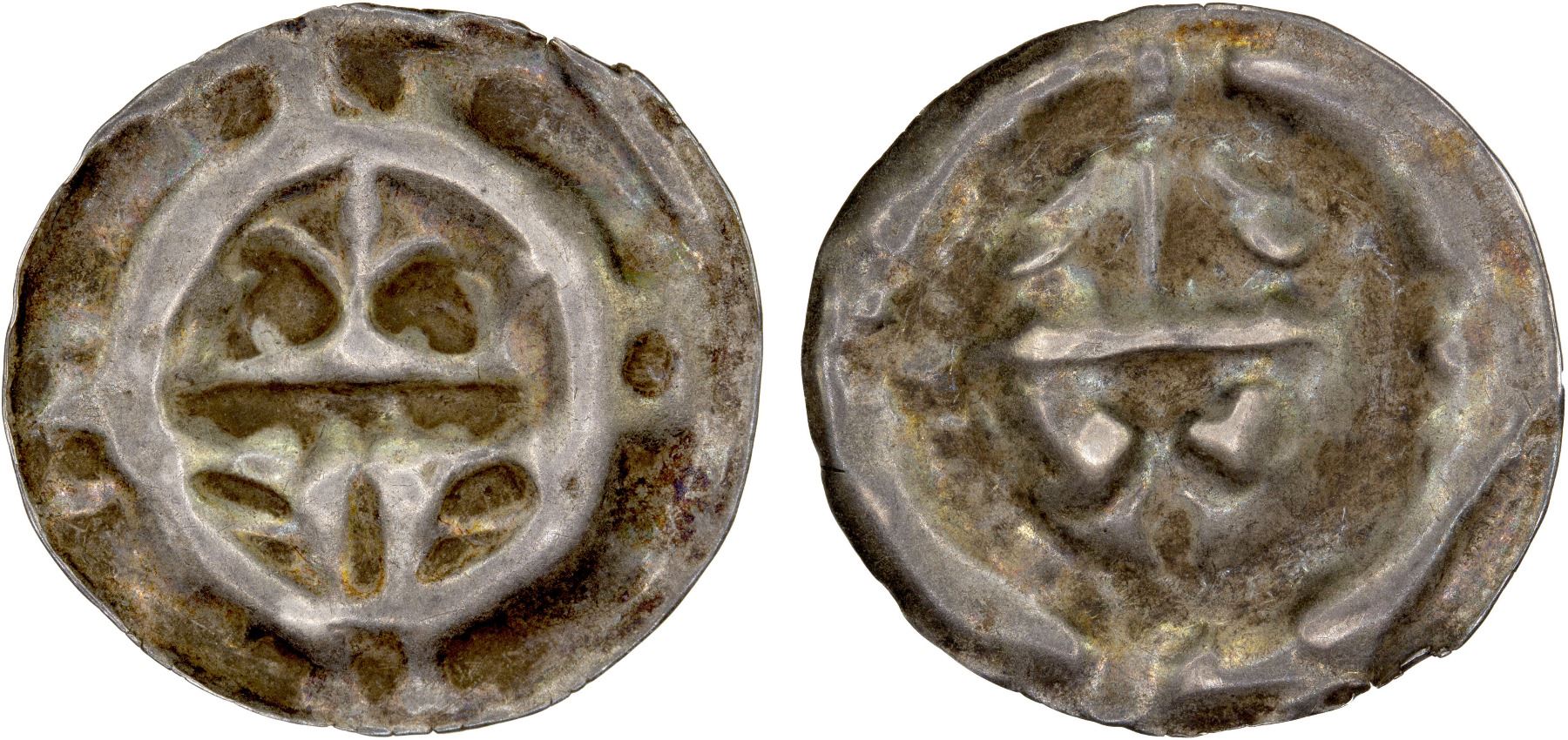 NORDHAUSEN: City, AR hohlpfennig (0.37g), ND (ca. 1400), Bonhoff-1209, Lobbecke-855, Posern-Klett-705, uniface bracteate, crown over two eagle heads facing outwards, VF, ex Joe Sedillot Collection.