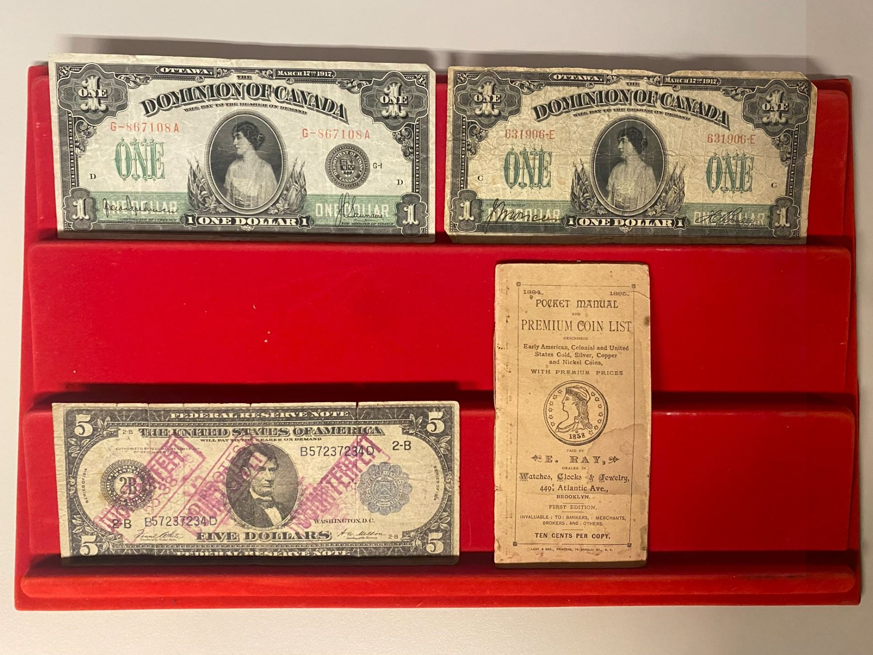 NORTH AMERICA: LOT of 3 banknotes, includes Canada 1917 series 1 dollar P-32e, another P-32a, and United States 1914 series 5 dollar P-359bB stamped three times on either side "COUNTERFIET 55-38", plus a "Pocket Manual and Premium Coin List" First Edition by E. Ray 1884-1885, average quality examples, a very interesting lot, retail value $250, lot of 3 banknotes.