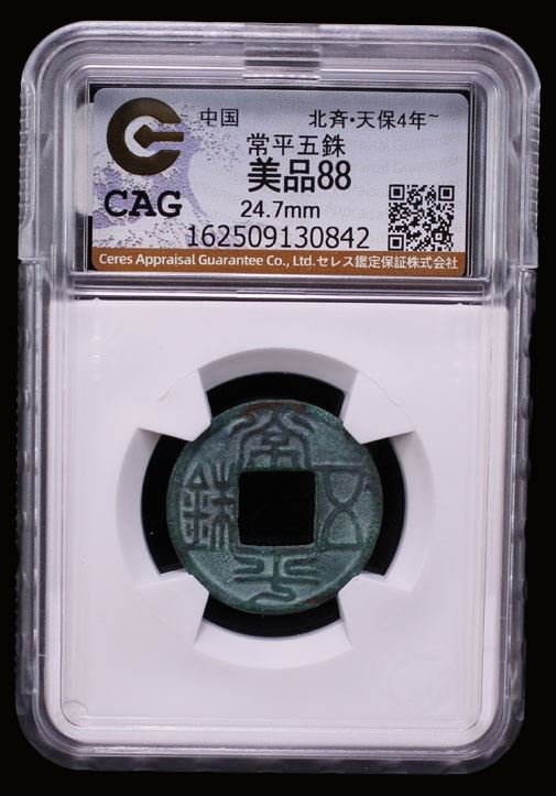 NORTHERN QI: Anonymous, 550-577, AE cash, H-13.27, chang ping wu zhu, graded 88 by CAG Grading Company, lovely patina, Choice VF. The legend on this coin translates as the "Constant and Regular Wu Zhu." They were cast by Emperor Wen Xuan in 553 and made in fine quality. Under the Northern Qi, there was an Eastern and a Western Coinage Region, under the Chamberlain for Palace Revenues.