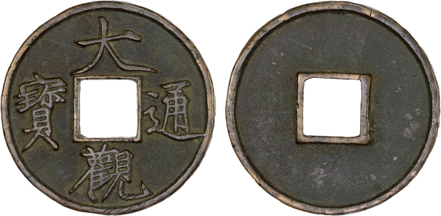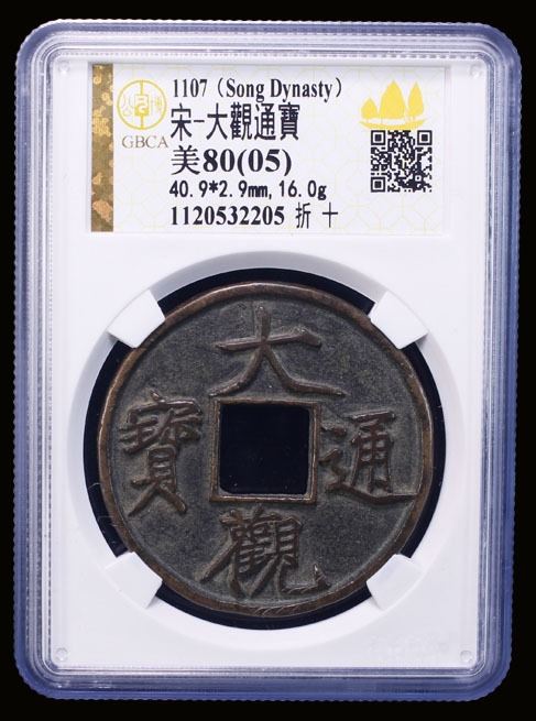 NORTHERN SONG: Da Guan, 1107-1110, AE 10 cash (16g), H-16.426, slender golden script, graded 82(05) by GBCA Grading Company, natural flan crack, XF. Slender golden script was created by Emperor Huizong (1100-1126) of the Song dynasty in the early 12th century. The name "Slender Golden" comes from the script's resemblance to twisted gold filaments. It was also inspired by an earlier calligrapher named Li Yu, who called his work "Golden Inlaid Dagger."