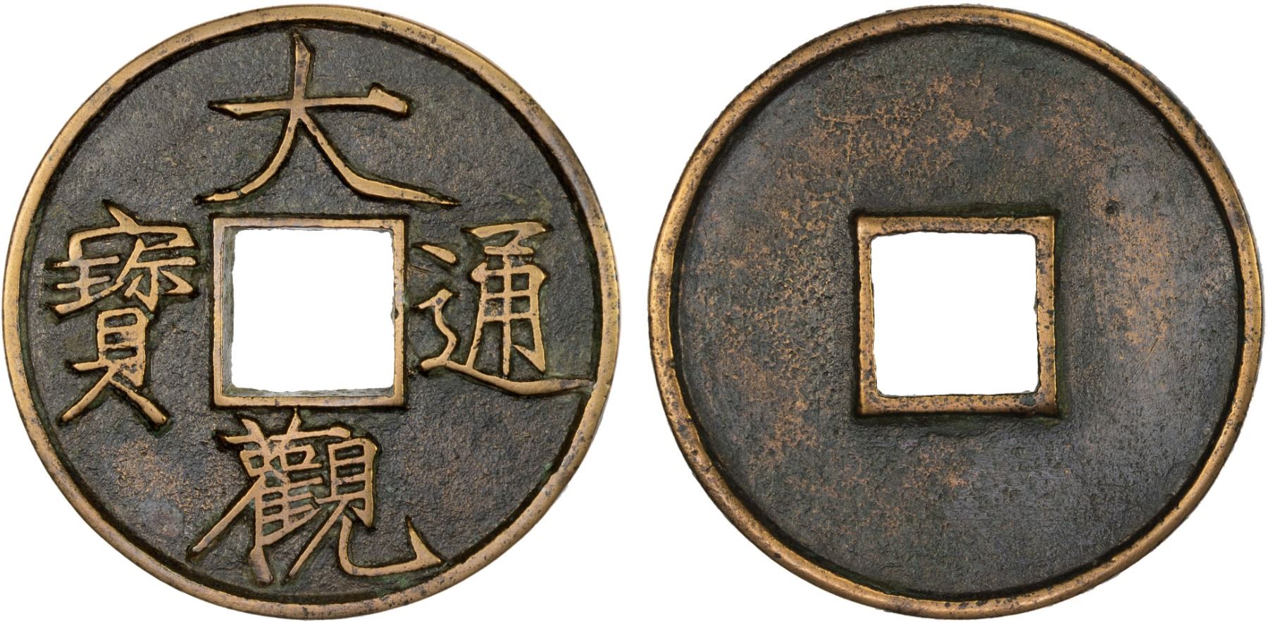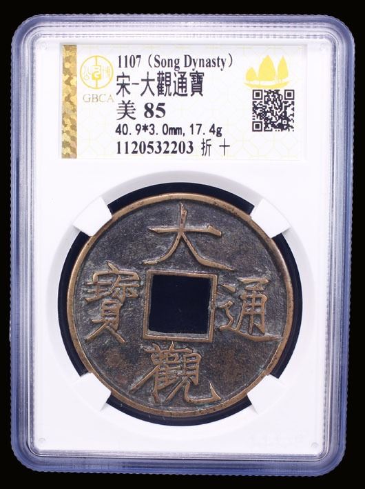 NORTHERN SONG: Da Guan, 1107-1110, AE 10 cash (17.4g), H-16.426, slender golden script, graded 85 by GBCA Grading Company, XF. Slender golden script was created by Emperor Huizong (1100-1126) of the Song dynasty in the early 12th century. The name "Slender Golden" comes from the script's resemblance to twisted gold filaments. It was also inspired by an earlier calligrapher named Li Yu, who called his work "Golden Inlaid Dagger."