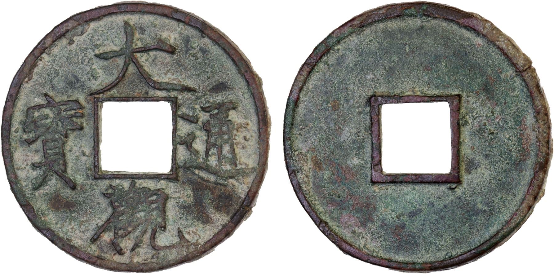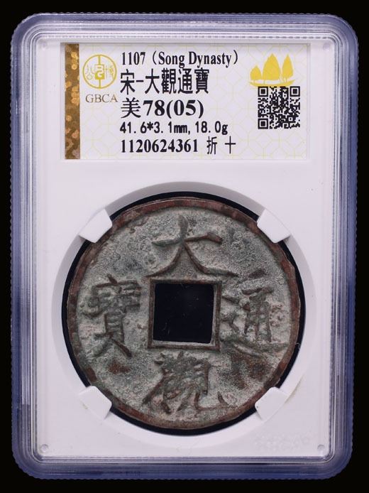 NORTHERN SONG: Da Guan, 1107-1110, AE 10 cash (18g), H-16.426, slender golden script, graded 78(05) by GBCA Grading Company, natural flan crack, VF-XF. This coin with the beautiful calligraphy, displayed at the left, is considered to be the "crown jewel " of Southern Dynasty coins. The coin was originally worth ten regular wu zhu coins, but because of popular discontent was revalued to one wu zhu.