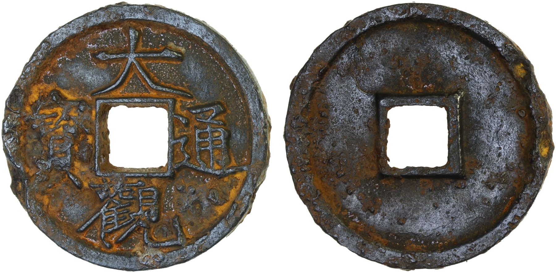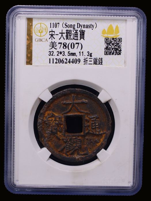 NORTHERN SONG: Da Guan, 1107-1110, iron 3 cash (11.3g), H-16.424, Slender Golden script, graded 78(07) by GBCA Grading Company, natural casting defects, VF. Slender golden script was created by Emperor Huizong (1100-1126) of the Song dynasty in the early 12th century. The name "Slender Golden" comes from the script's resemblance to twisted gold filaments. It was also inspired by an earlier calligrapher named Li Yu, who called his work "Golden Inlaid Dagger."