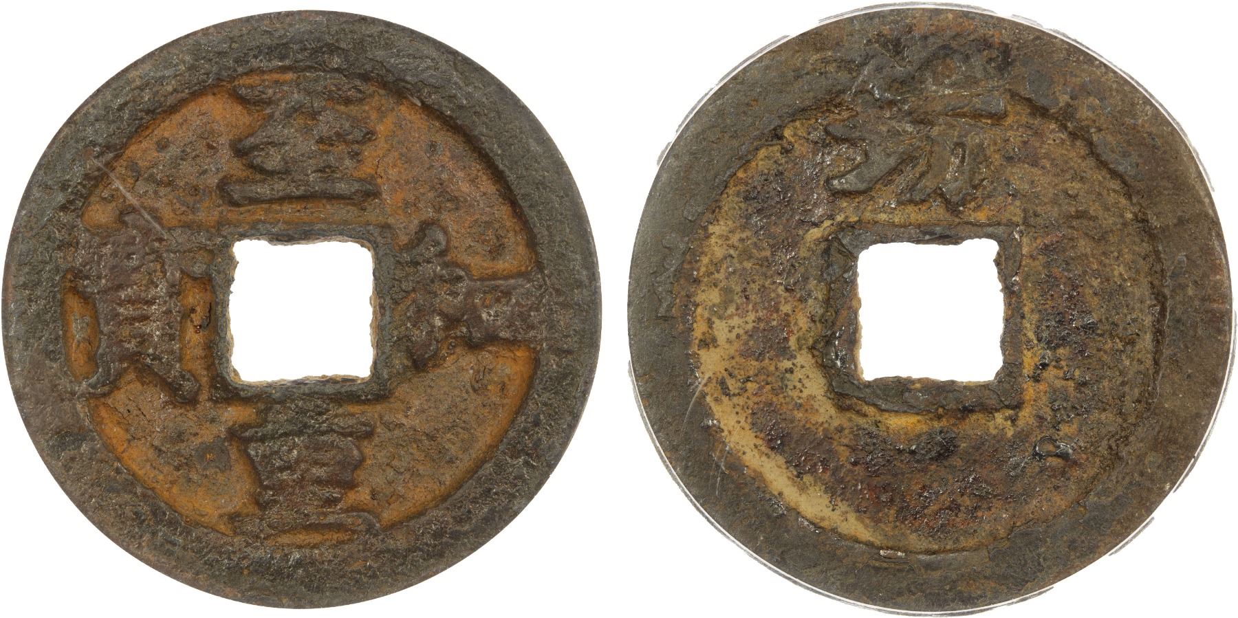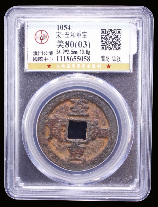 NORTHERN SONG: Zhi He, 1054-1055, iron large cash (10.8g), Fangzhou Mint, Shaanxi Province, H-16.144, fang above on reverse, a very scarce iron issue with mint name, graded 80(03) by GBCA Grading Company, repaired, VF.