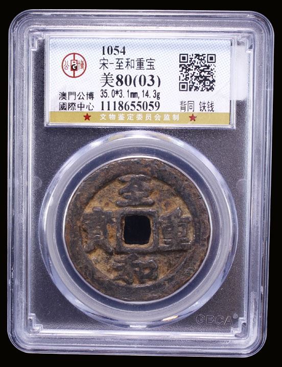 NORTHERN SONG: Zhi He, 1054-1055, iron large cash (14.3g), Tongzhou Mint, Shaanxi Province, H-16.145A, tong above on reverse, a very scarce iron issue with mint name, graded 80(03) by GBCA Grading Company, repaired, VF.