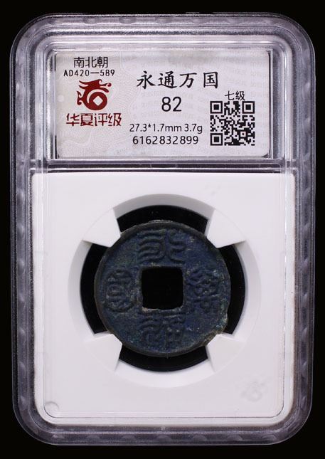 NORTHERN ZHOU: Anonymous, 557-581, AE cash (3.7g), H-13.32, yong tong wan guo ("everlasting circulation in ten thousand kingdoms") in archaic script, graded 82 by Huaxia Grading Company, VF. This piece was issued in 579 AD by Emperor Xuan. Its nominal weight was 12 zhu, and the coin was meant to be equivalent to ten wu xing coins and written in the Yu Zhu (jade chopstick) style of calligraphy which is greatly admired.