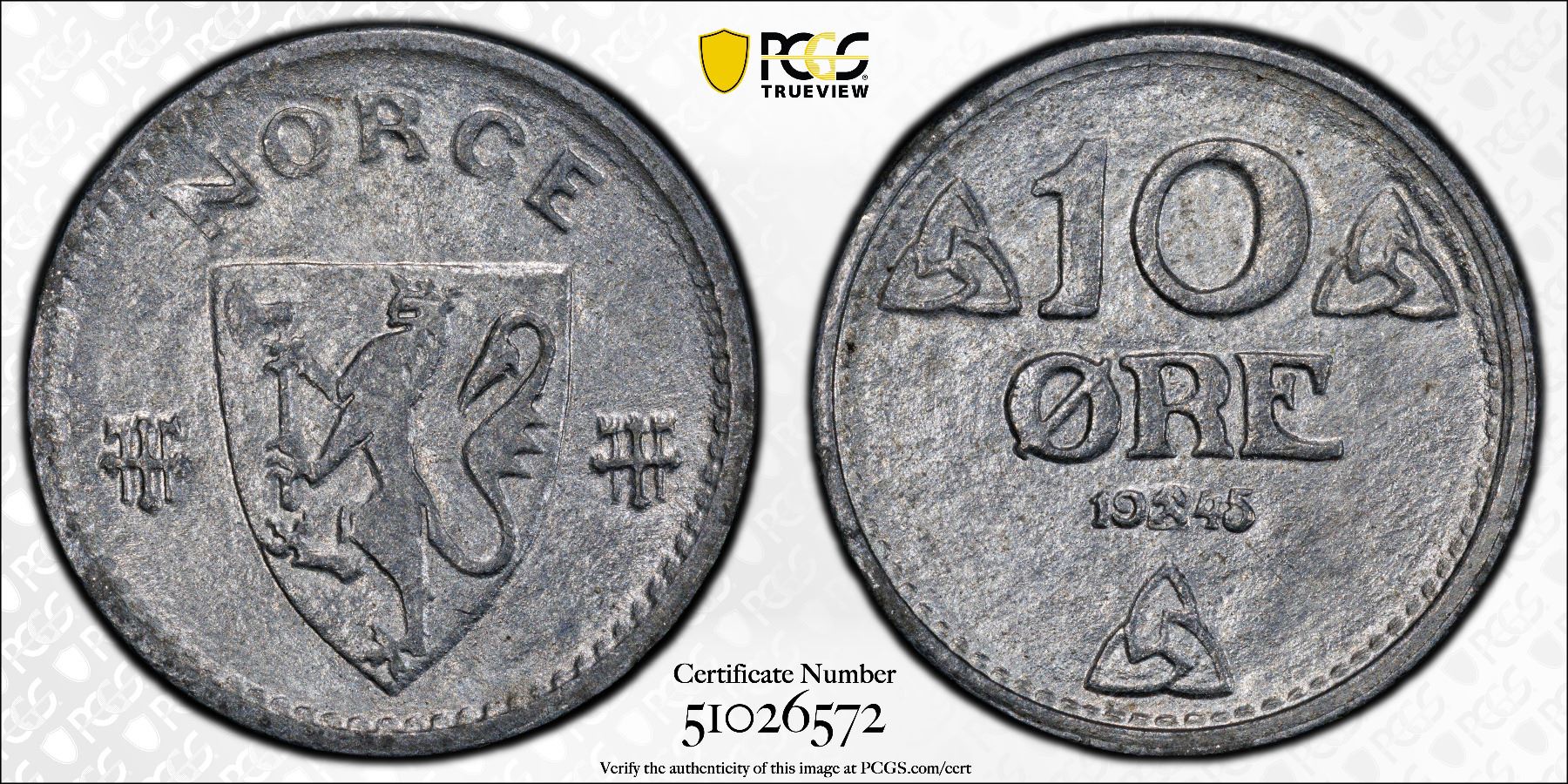 NORWAY: German Occupation, 10 ore, 1945, KM-189, a superb mint state example! PCGS graded MS65. During the German occupation of Norway the composition of the 10 ore was changed from copper-nickel to zinc for the war effort. The obverse was also changed to no longer include the Norwegian crown and the royal motto.