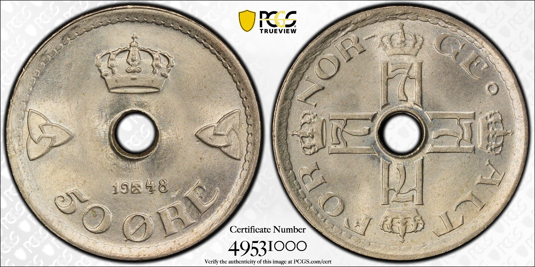 NORWAY: Haakon VII, 1905-1957, 50 ore, 1948, PCGS MS65