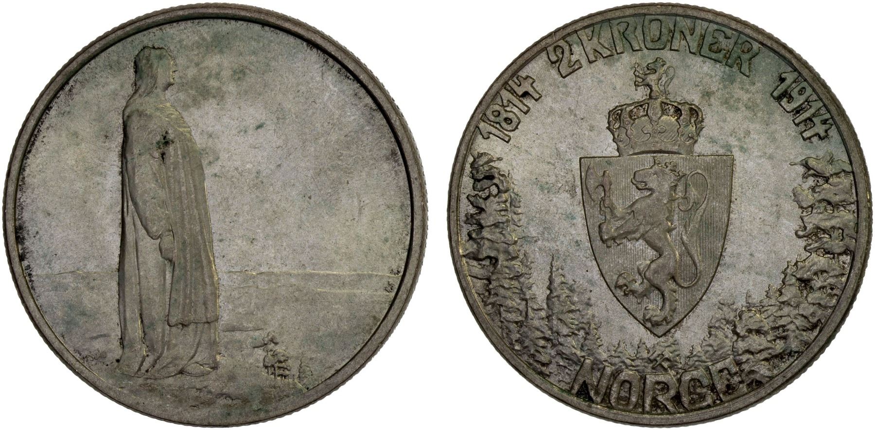 NORWAY: Haakon VII, 1905-1957, AR 2 kroner, 1914, KM-377, Norwegian Constitution Centennial - "Mor Norge (Mother Norway)" type, an attractive lustrous example, AU.