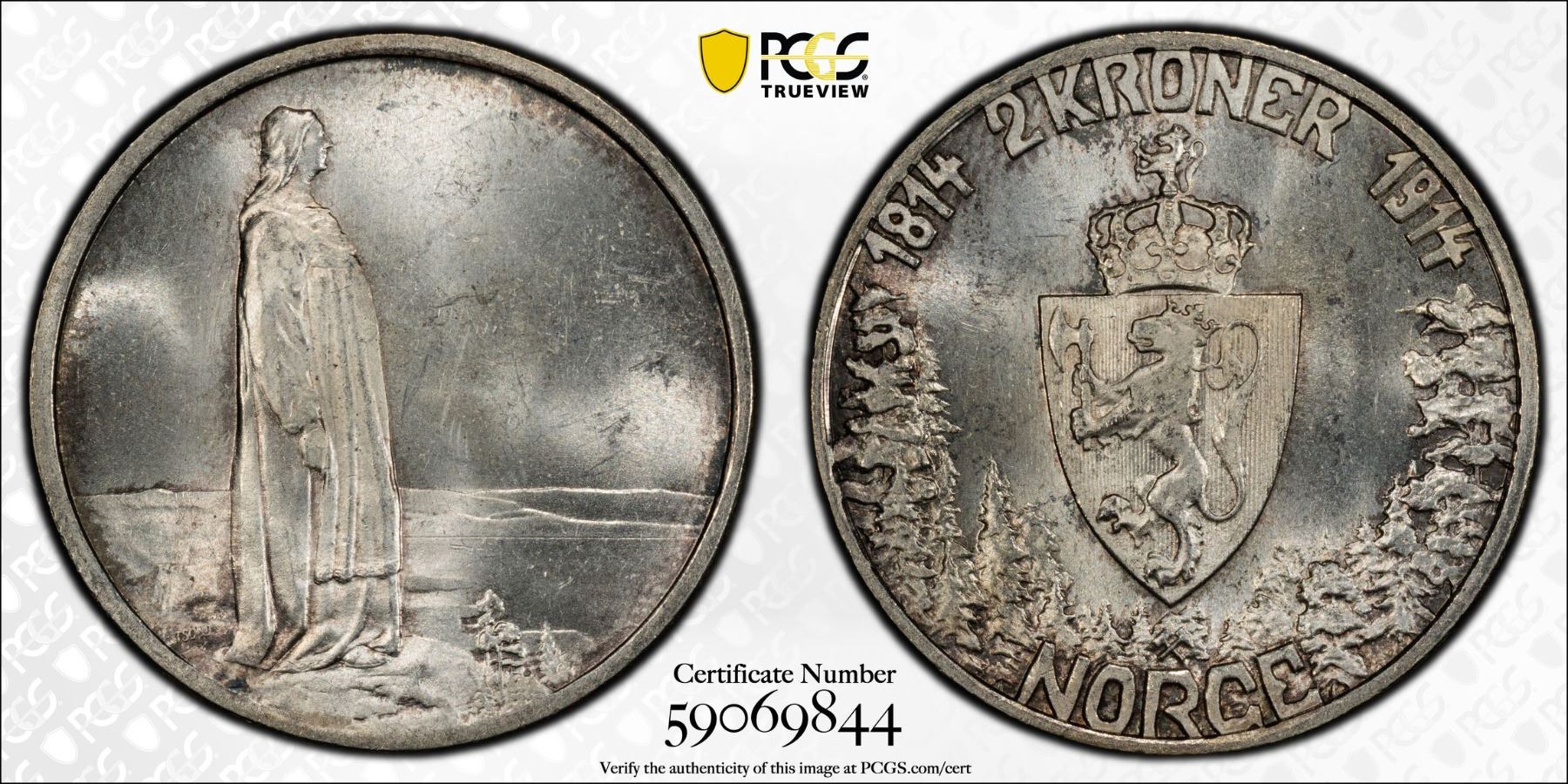 NORWAY: Haakon VII, 1905-1957, AR 2 kroner, 1914, KM-377, Norwegian Constitution Centennial - "Mor Norge (Mother Norway)" type, a lovely lustrous example! PCGS graded MS63.