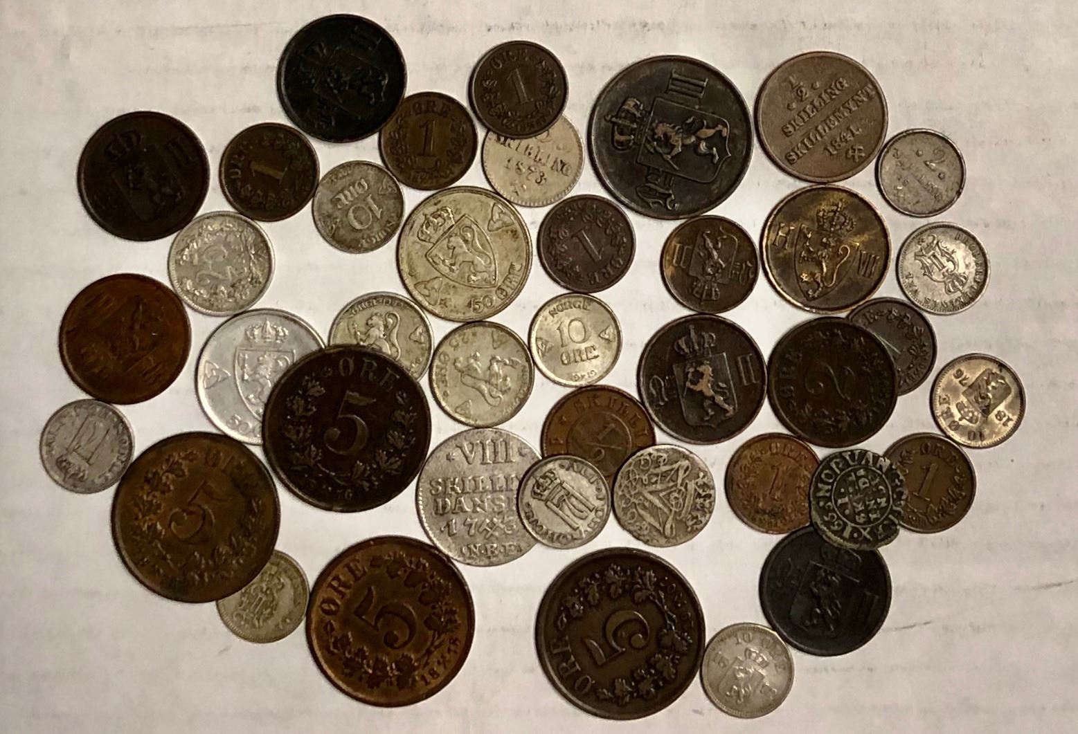 NORWAY:LOT of 40 loose coins: ½ skilling (2), skilling (1), 2 skilling (2, including 1717), 3 skilling (1), 8 skilling (1, 1731), øre (8), 2 øre (7), 5 øre (5), 10 øre (8, including 1876 EF and 1919 AU), 25 øre (3), and 50 øre (2, including 1919 AU); better than average circulated grades, many types and dates, retail value $600, lot of 40 pieces.