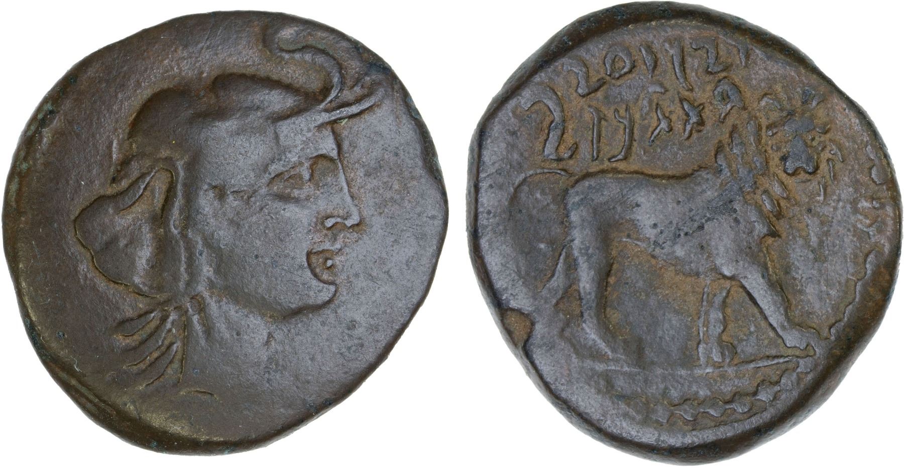 NUMIDIA: Juba I, ca. 60-46 BC, AE22 (7.87g), Müller-58, MAA-36, SNG Copenhagen 532, head of Africa right, wearing elephant headdress // lion walking right, Neo-Punic inscription YWB`Y / HMMLKT ("the Kingdom of Juba") above, brown patina, VF.