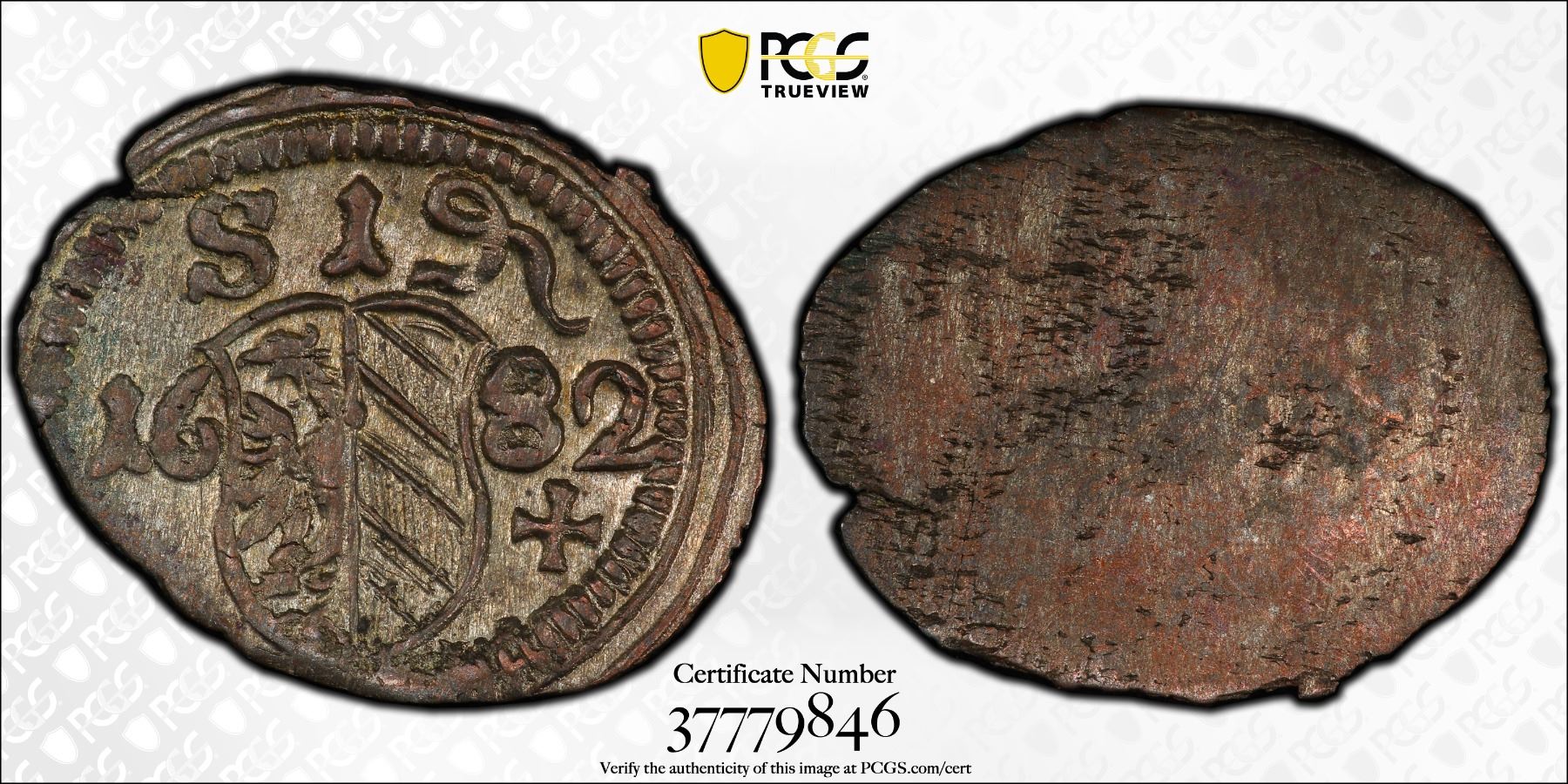NUREMBERG: Free Imperial City, AR pfennig, 1682, KM-193, coat of arms of Nürnberg, uniface, PCGS graded MS64.