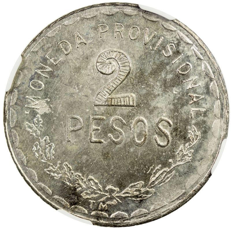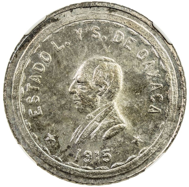 OAXACA: AR 2 pesos, 1915, KM-744, GB-357, Oax-113, nice strike with appealing light toning over full luster, reverse rotated about 30 degrees, only one certified by NGC (April 2016), NGC graded MS63, R-3.