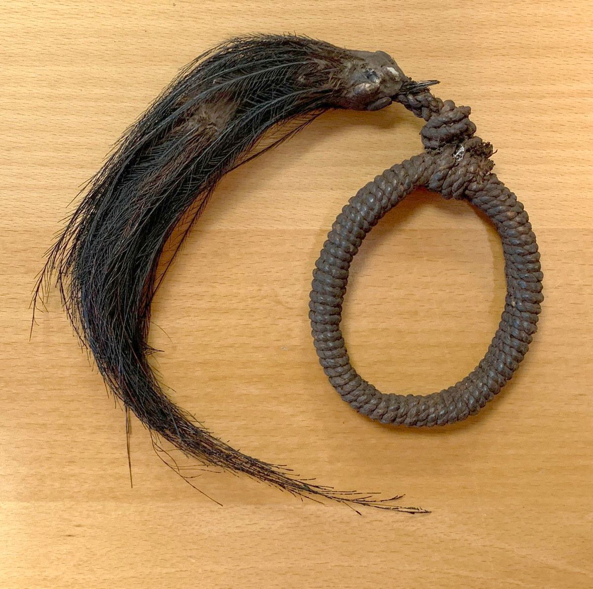 OCEANIA: PAPUA NEW GUINEA: cassowary feather, Opitz p.103, consisting of a bunch of feathers ca. 20-30cm long, bound together at the end with tree sap and attached to a woven armband, used for making headdresses and masks and used in bride price and moka gifts (cf. Opitz p.225-26), VF, ex Charles Opitz Collection.