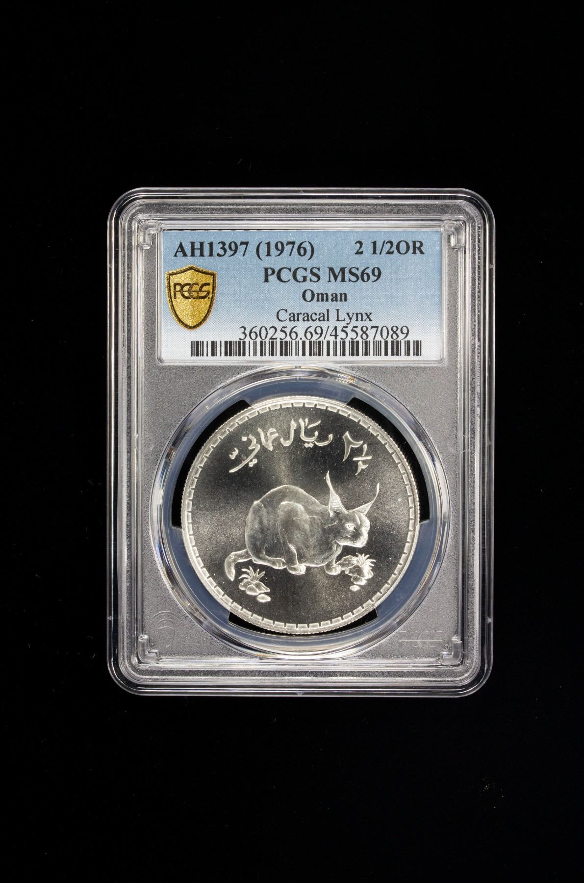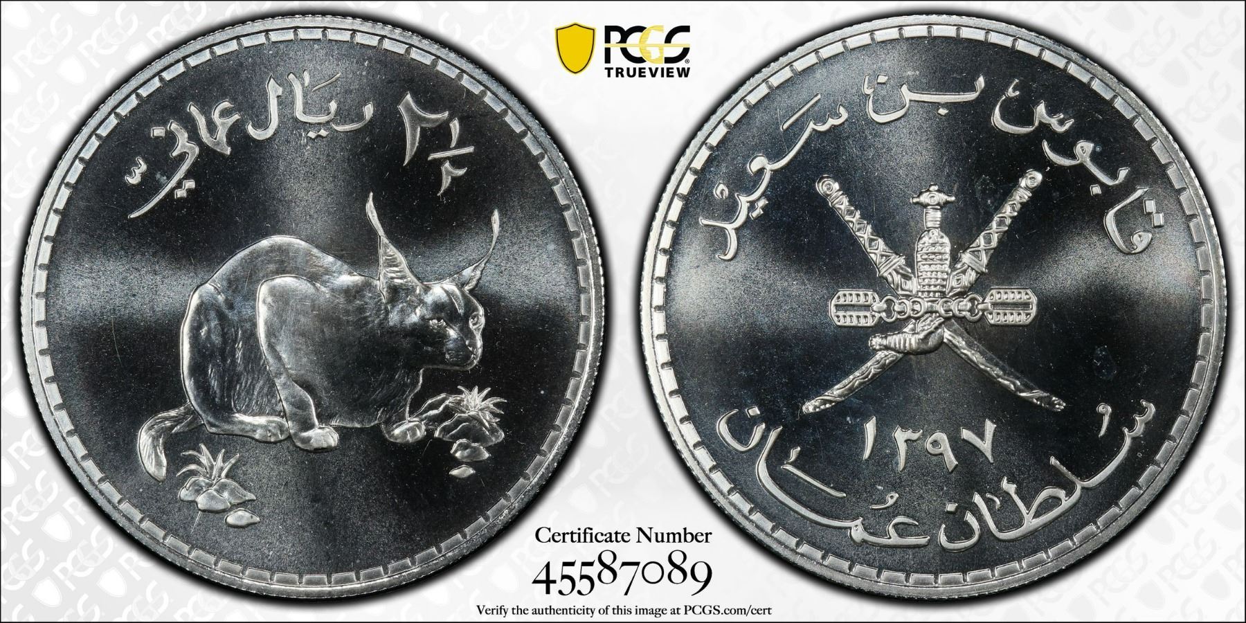 OMAN: Qaboos bin Said, 1970-2020, AR 2½ rials, AH1397, KM-60, Conservation Series - Caracal Lynx, PCGS graded MS69.