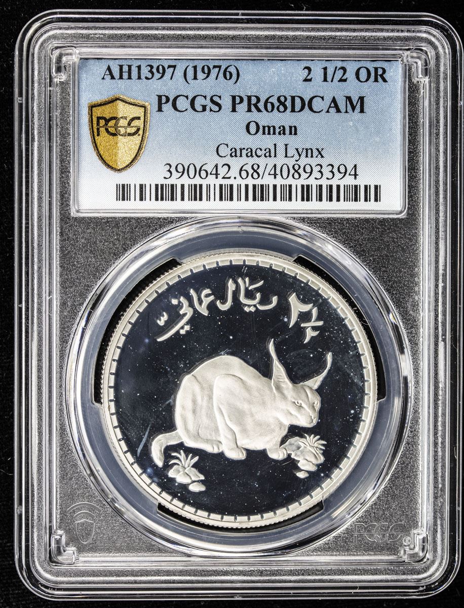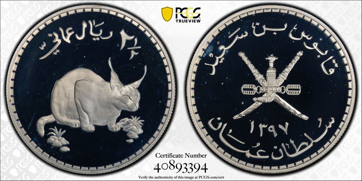 OMAN: Qaboos bin Said, 1970-2020, AR 2½ rials, AH1397, KM-60, Wildlife Conservation - Caracal, PCGS graded Proof 68.