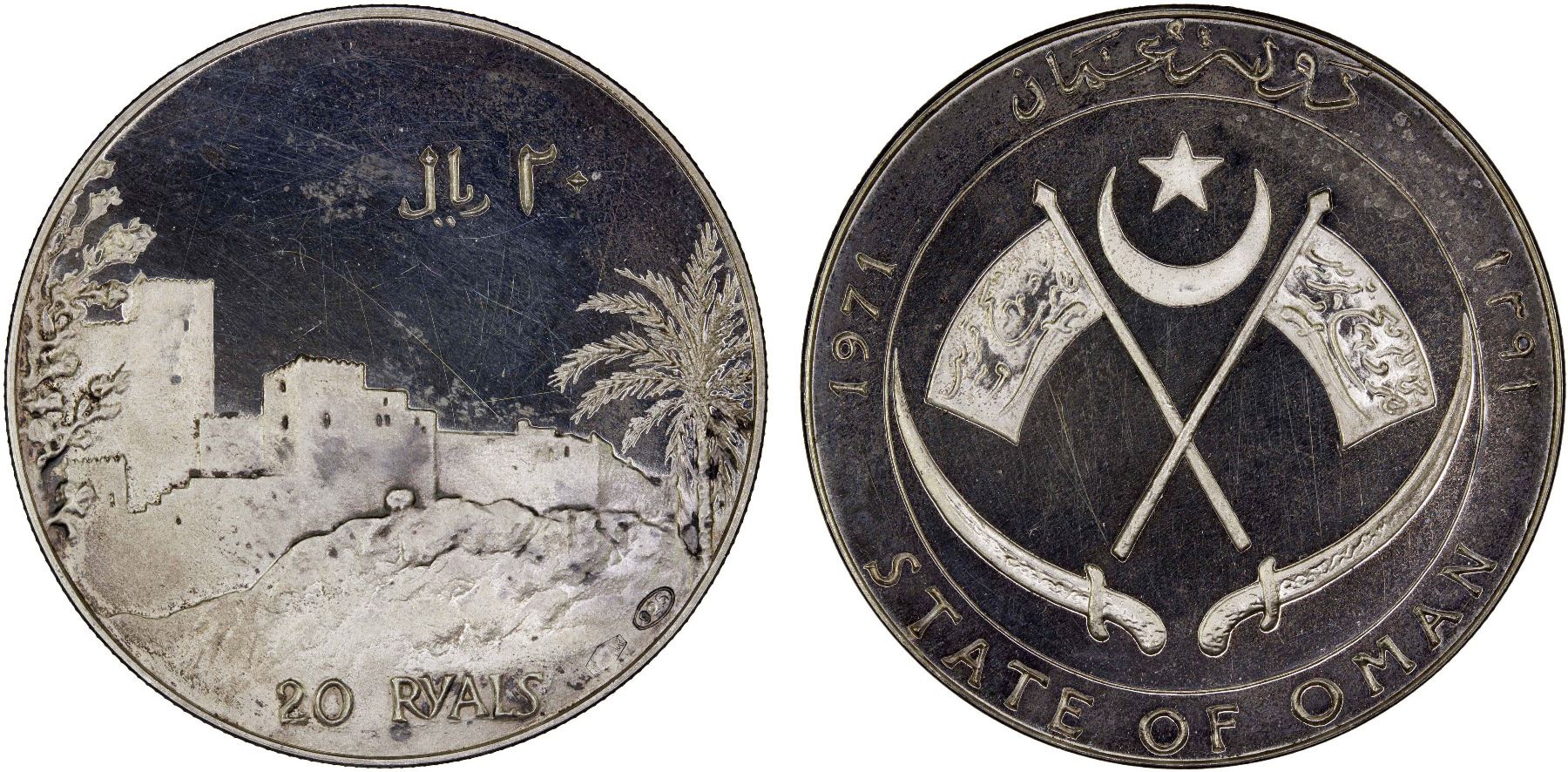 OMAN: Qaboos bin Said, 1970-2020, AR 20 ryals, 1971/AH1391, Bruce-X3, medallic issue: mosque; hairlined, mintage of only 4,000 pieces, Proof, R, ex Dr. Wolfgang Schuster Collection. These issues, inscribed STATE OF OMAN, were issued by the exiled government of Imam Ghalib Ibn Ali in Dammam, Saudi Arabia. The Imam has been in exile since 1955.