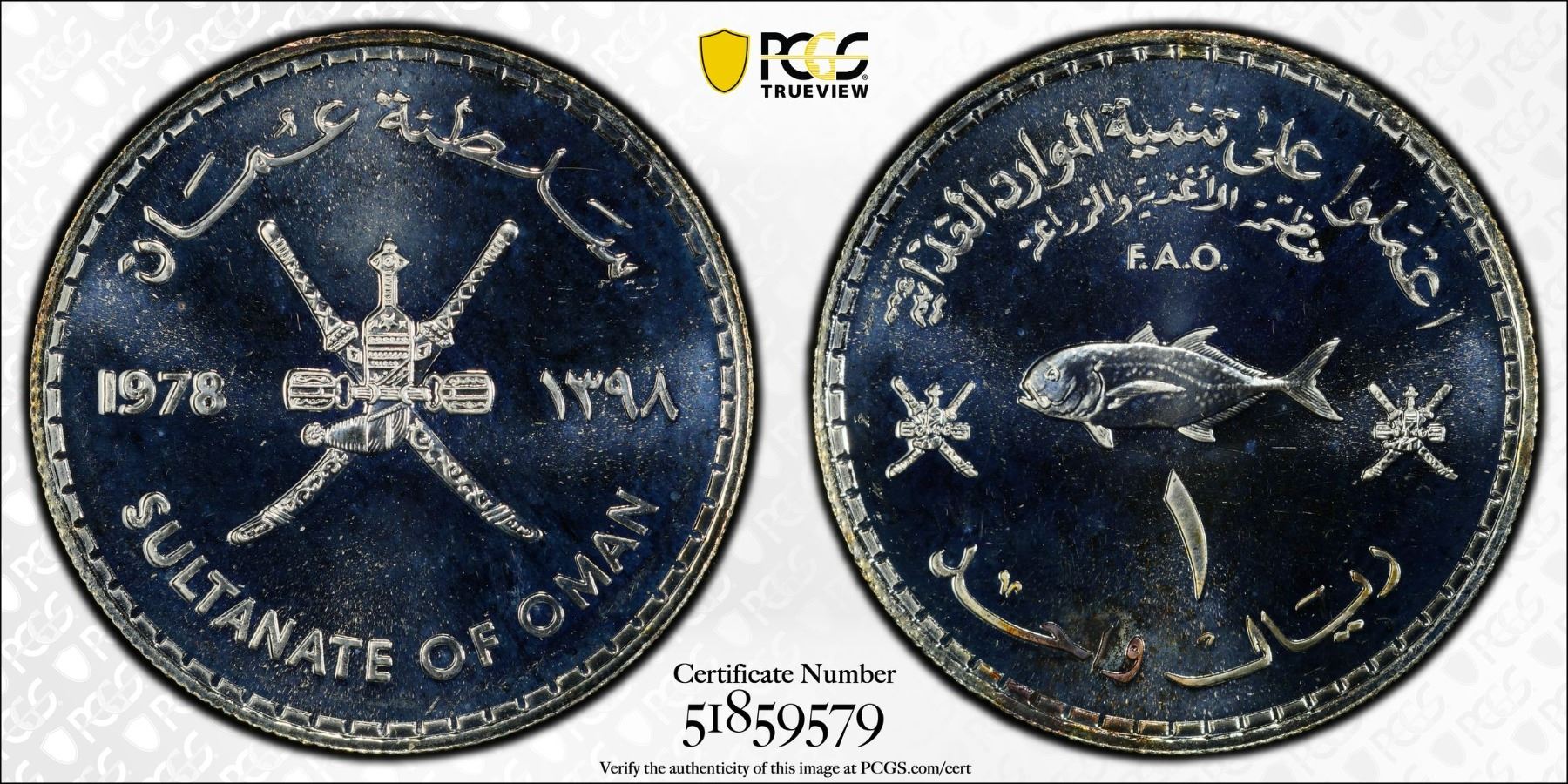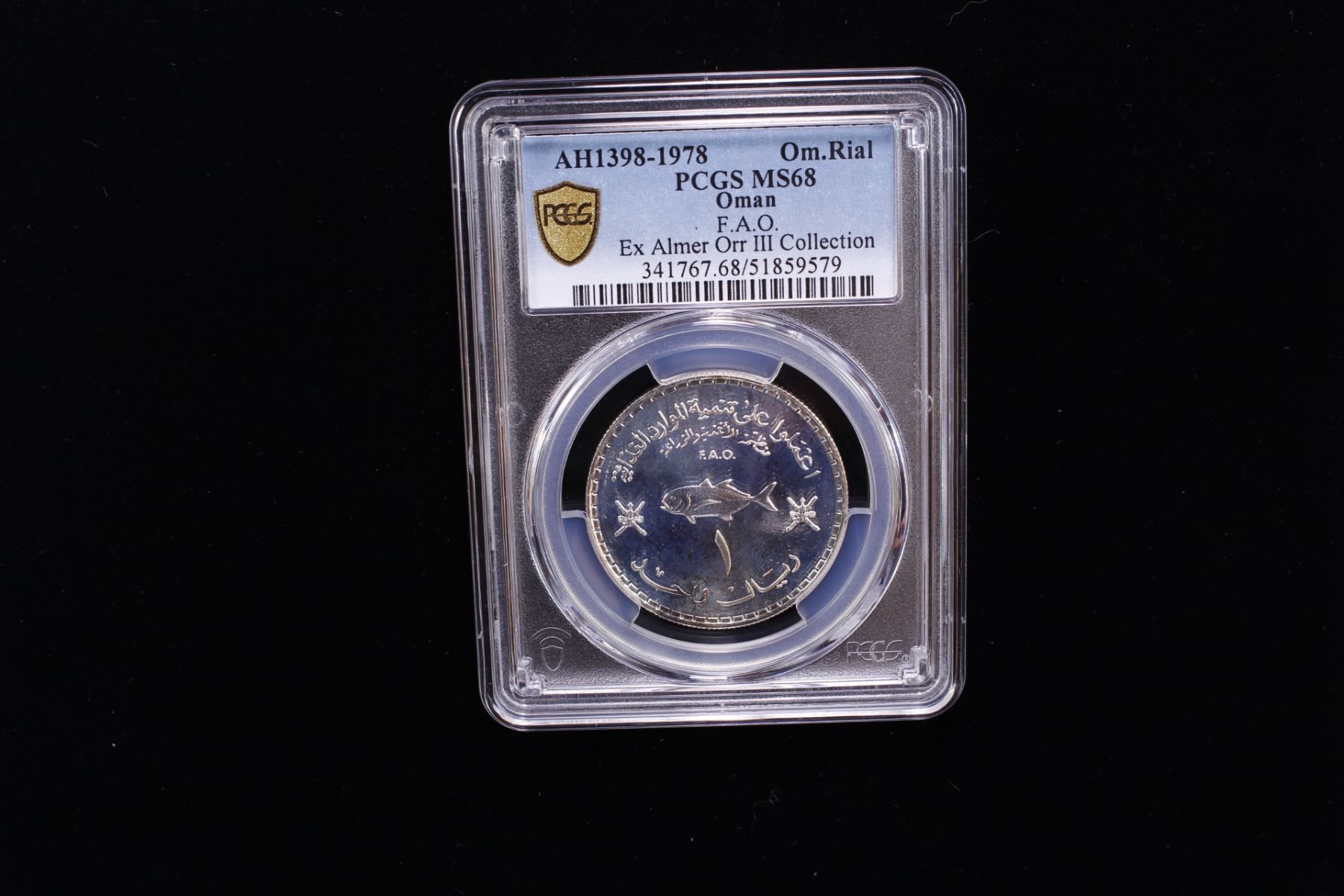 OMAN: Qaboos bin Said, 1970-2020, AR omani rial, 1978/AH1398, KM-65, a spectacular example, PCGS graded MS68, ex Almer H. Orr III Collection.
