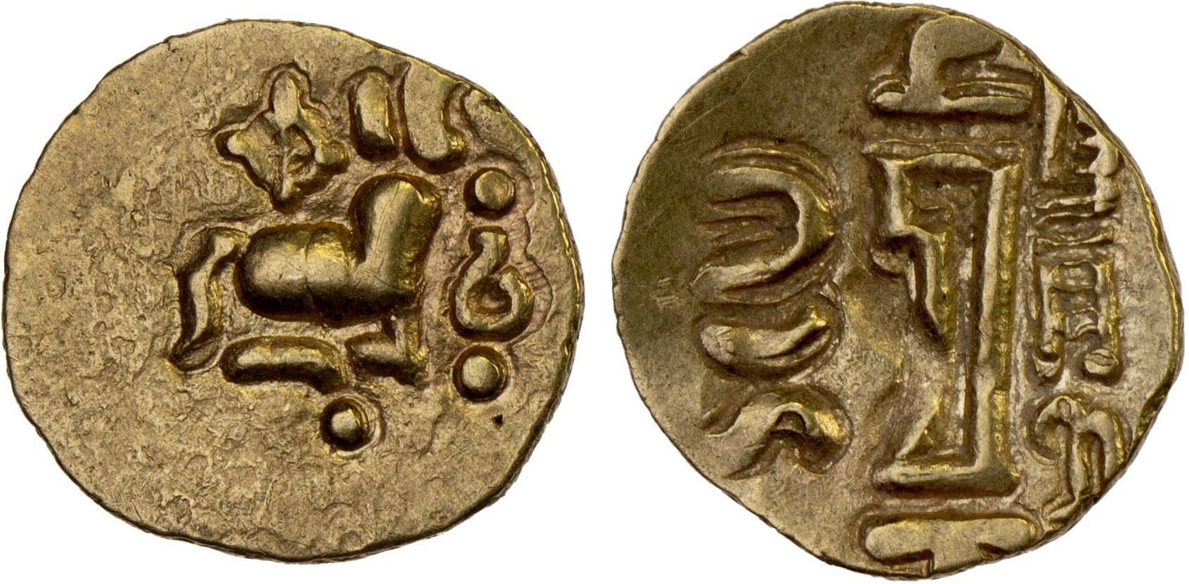 ORISSA: Anonymous, 12th/13th century, AV fanam (0.43g), Tripathy-2, couchant bull, chakra above, simple conch & dots before, VF.