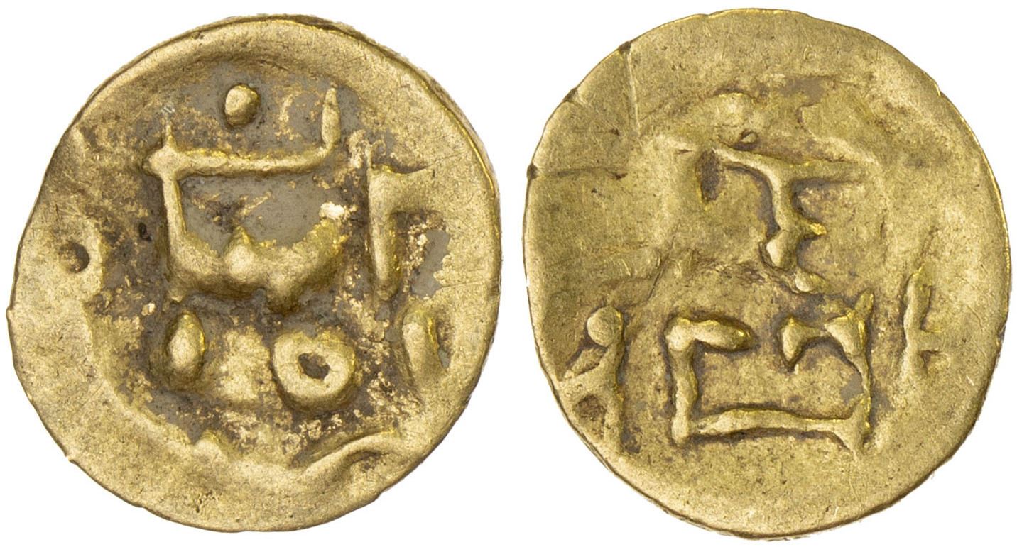ORISSA: Sri Rama, 13th century, AV fanam (0.48g), year unclear, Tripathy-1, sa + date // couchant bull, usual symbols, VF. Odisha, formerly Orissa, is a state located in Eastern India. The ancient kingdom of Kalinga, which was invaded by the Mauryan Emperor Ashoka in 261 BCE resulting in the Kalinga War, coincides with the borders of modern-day Odisha. The Somavamshi (or Keshari) dynasty ruled parts of present-day Odisha in eastern India between the 9th and the 12th centuries. Their capitals included Yayatinagara (modern Binka) and Abhinava-Yayatinagara (modern Jajpur).