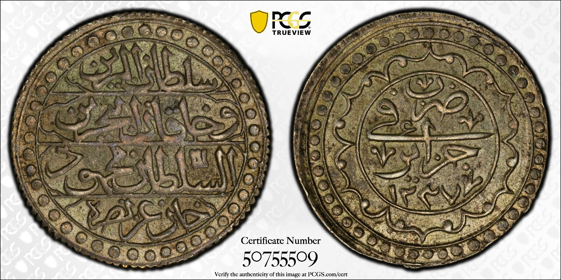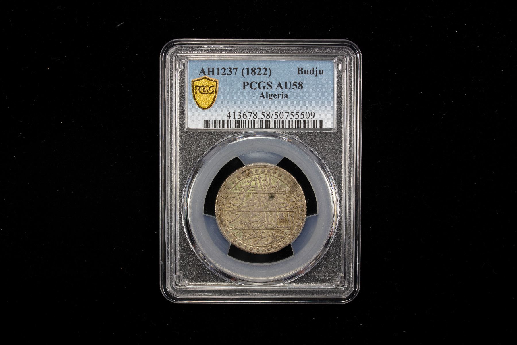 ALGIERS: Mahmud II, 1808-1830, AR budju, Jaza'ir, AH1237 (1822), KM-68, a lustrous near mint state example, PCGS graded AU58.
