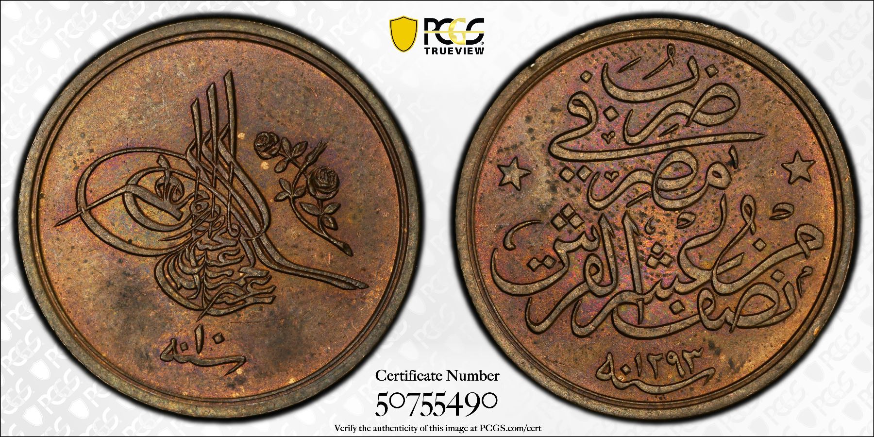 OTTOMAN: EGYPT: Abdul Hamid II, 1876-1909, AE 1/20 qirsh, Misr, AH1293 year 10 (1885), PCGS MS64 BN