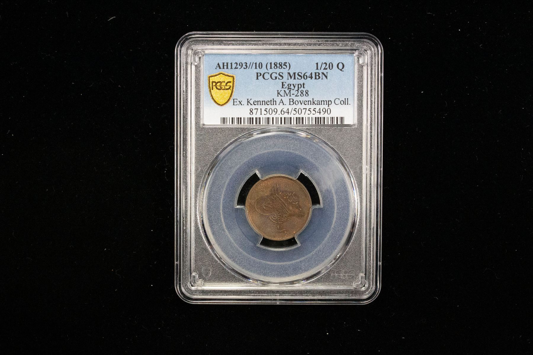 EGYPT: Abdul Hamid II, 1876-1909, AE 1/20 qirsh, Misr, AH1293 year 10 (1885), KM-288, a wonderful lustrous chocolate brown mint state example! PCGS graded MS64 BN, ex Kenneth A. Bovenkamp Collection.