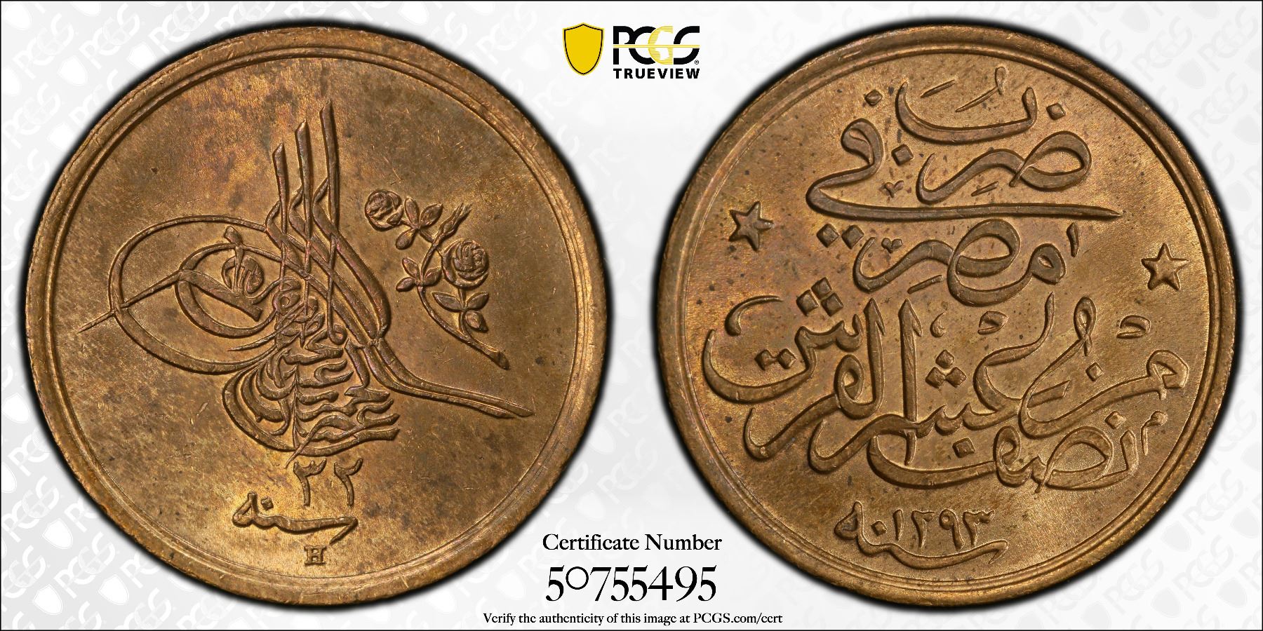 OTTOMAN: EGYPT: Abdul Hamid II, 1876-1909, AE 1/20 qirsh, Misr, AH1293 year 32 (1907), PCGS MS64 RB