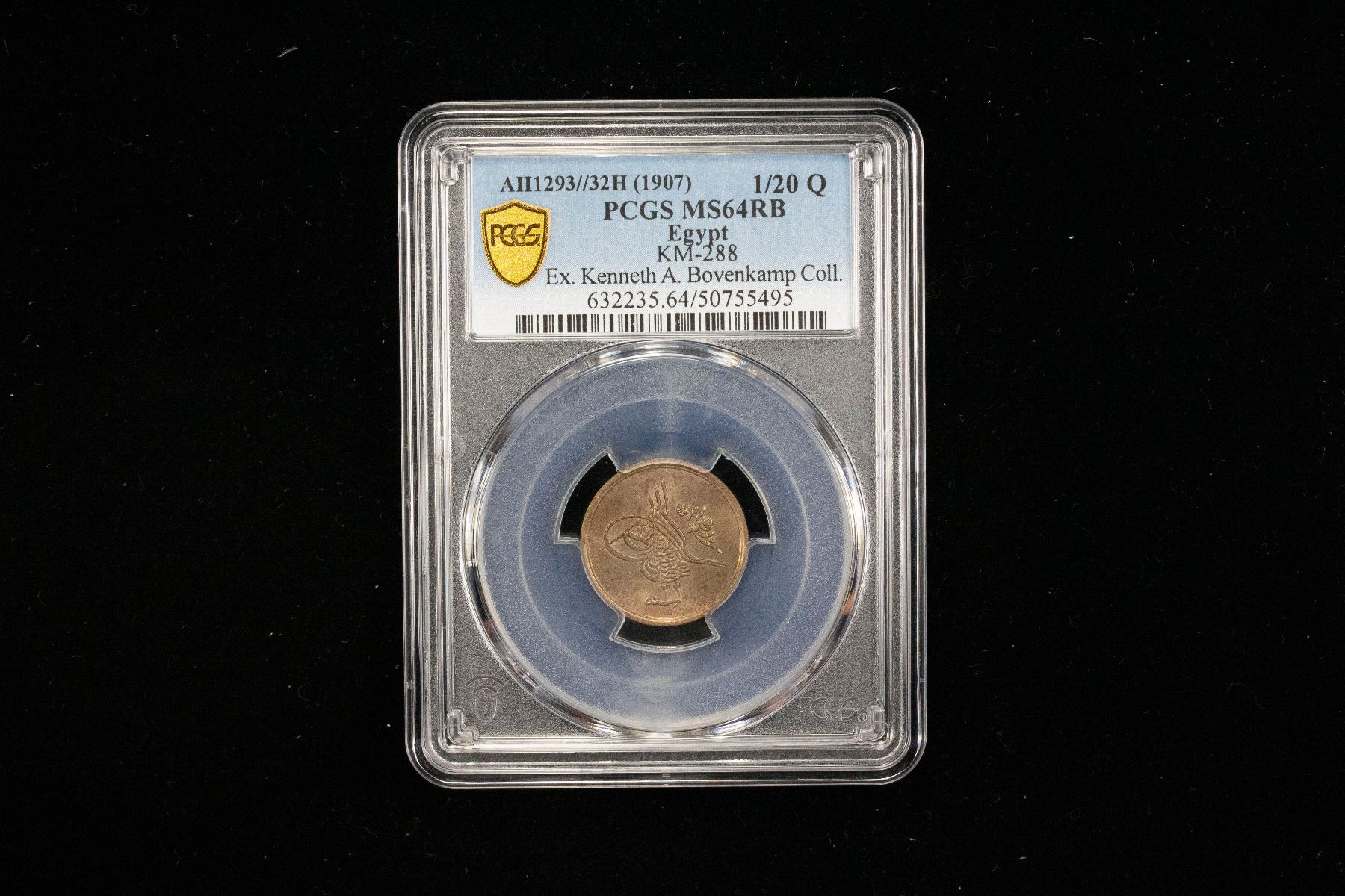 EGYPT: Abdul Hamid II, 1876-1909, AE 1/20 qirsh, Misr, AH1293 year 32 (1907), KM-288, struck at the Heaton mint, Birmingham, a wonderful lustrous caramel red brown mint state example! PCGS graded MS64 RB, ex Kenneth A. Bovenkamp Collection.