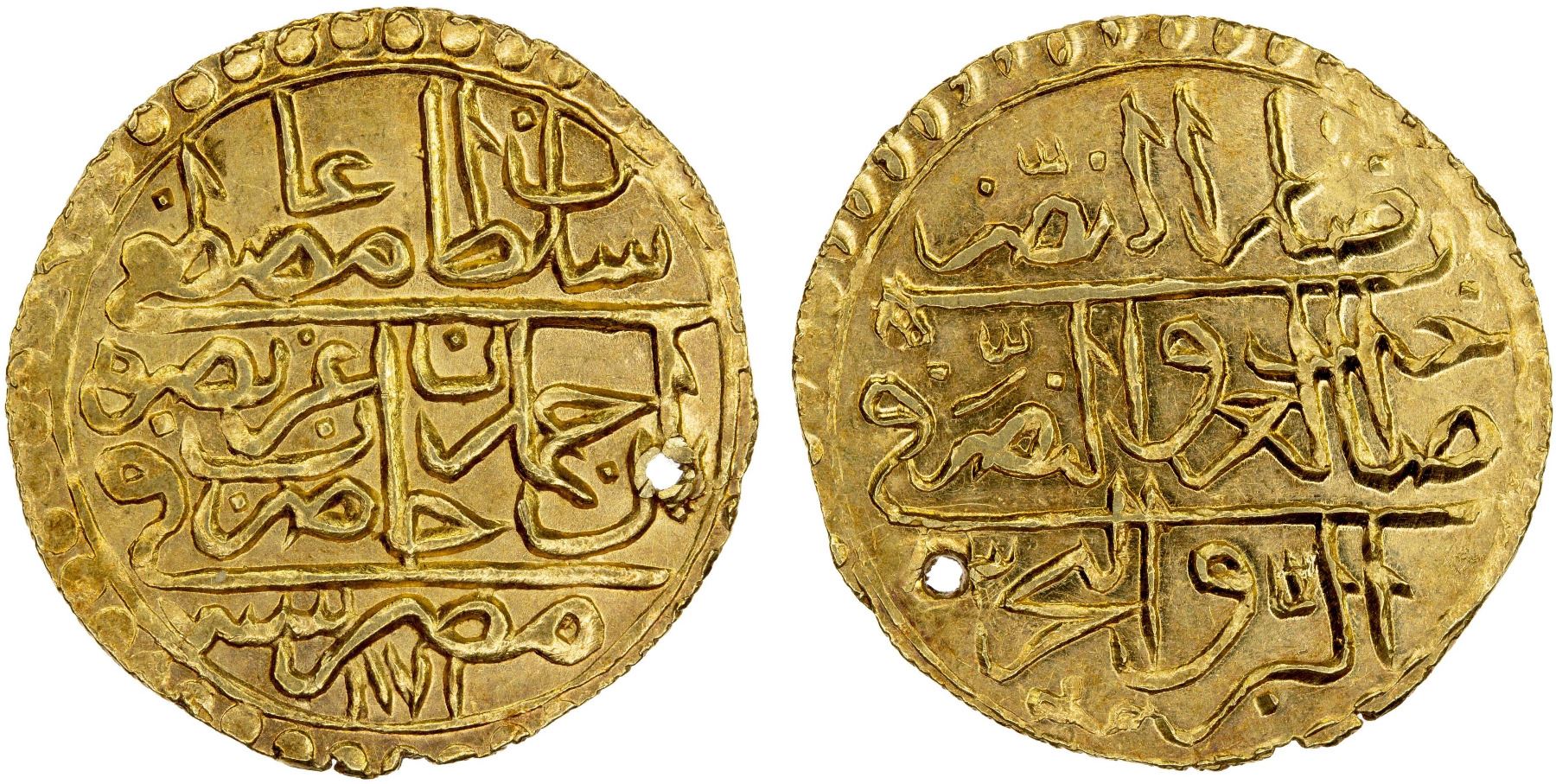 OTTOMAN EGYPT: Ali Bey, rebel 1769-1773, AV zeri mahbub (2.63g), Misr, AH1171 year AH[11]83, KM-119. NP-626, initial letter ayn for Ali, still in the name of Mustafa III, small piercing which is unfortunate because otherwise it would be highly lustrous UNC, still very attractive, lustrous AU, ex Ken Bovenkamp.