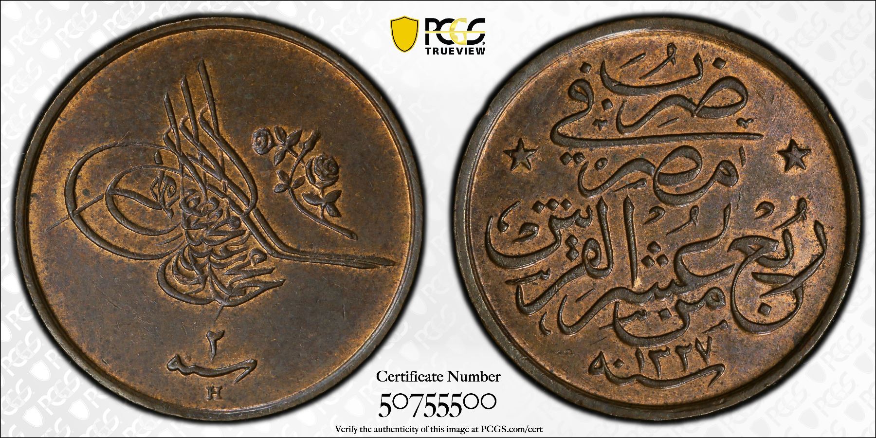 OTTOMAN: EGYPT: Mohammad V, 1909-1914, AE 1/40 qirsh, Misr, AH1327 year 2 (1910), PCGS MS63 BN