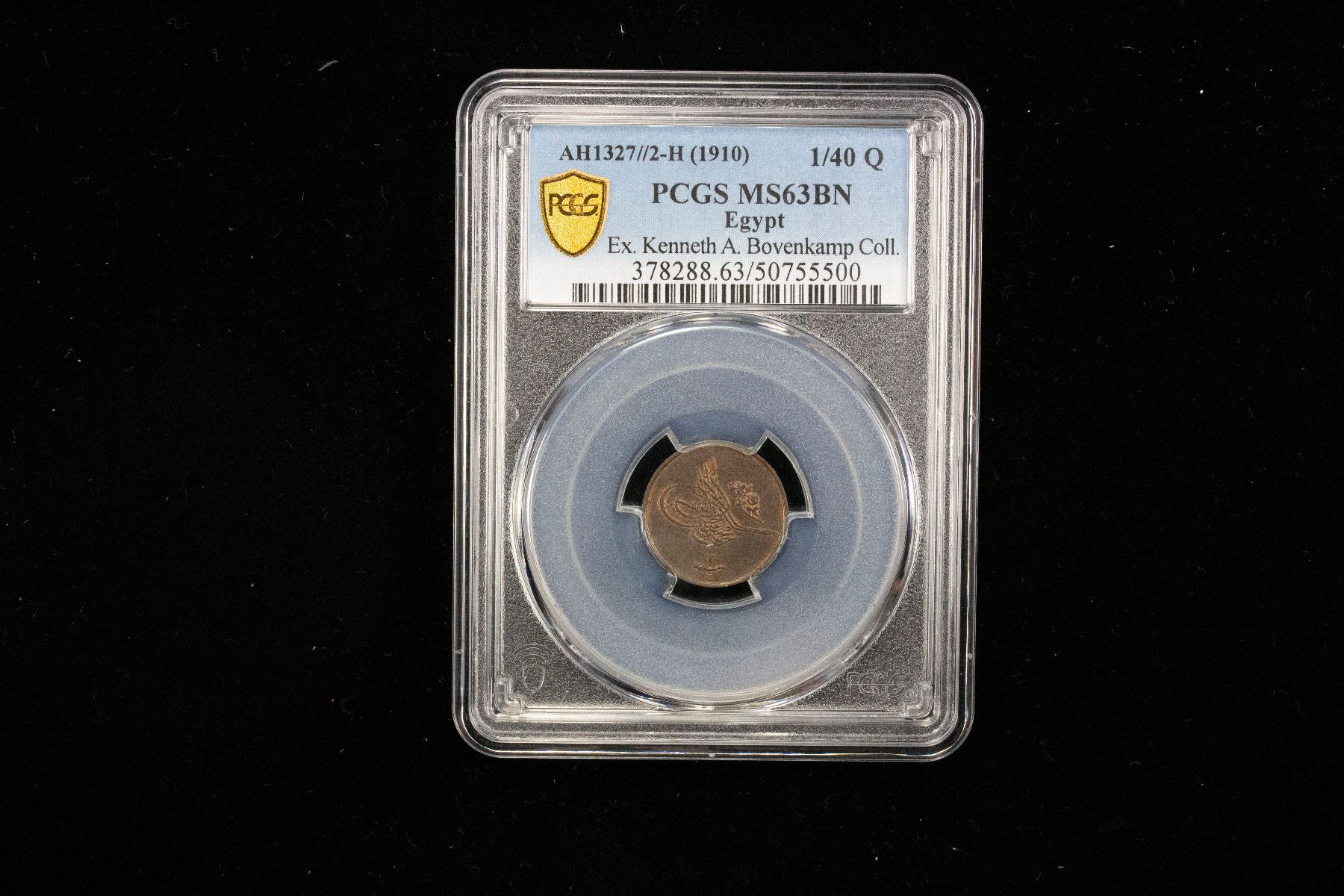 EGYPT: Mohammad V, 1909-1914, AE 1/40 qirsh, Misr, AH1327 year 2 (1910), KM-300, struck at the Heaton mint, Birmingham, a lovely lustrous chocolate brown mint state example! PCGS graded MS63 BN, ex Kenneth A. Bovenkamp Collection.