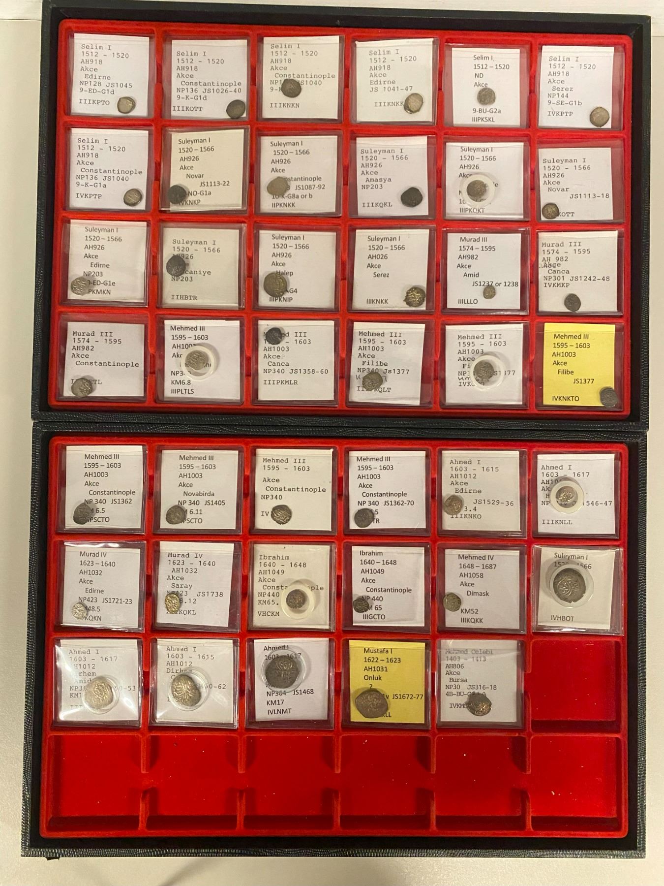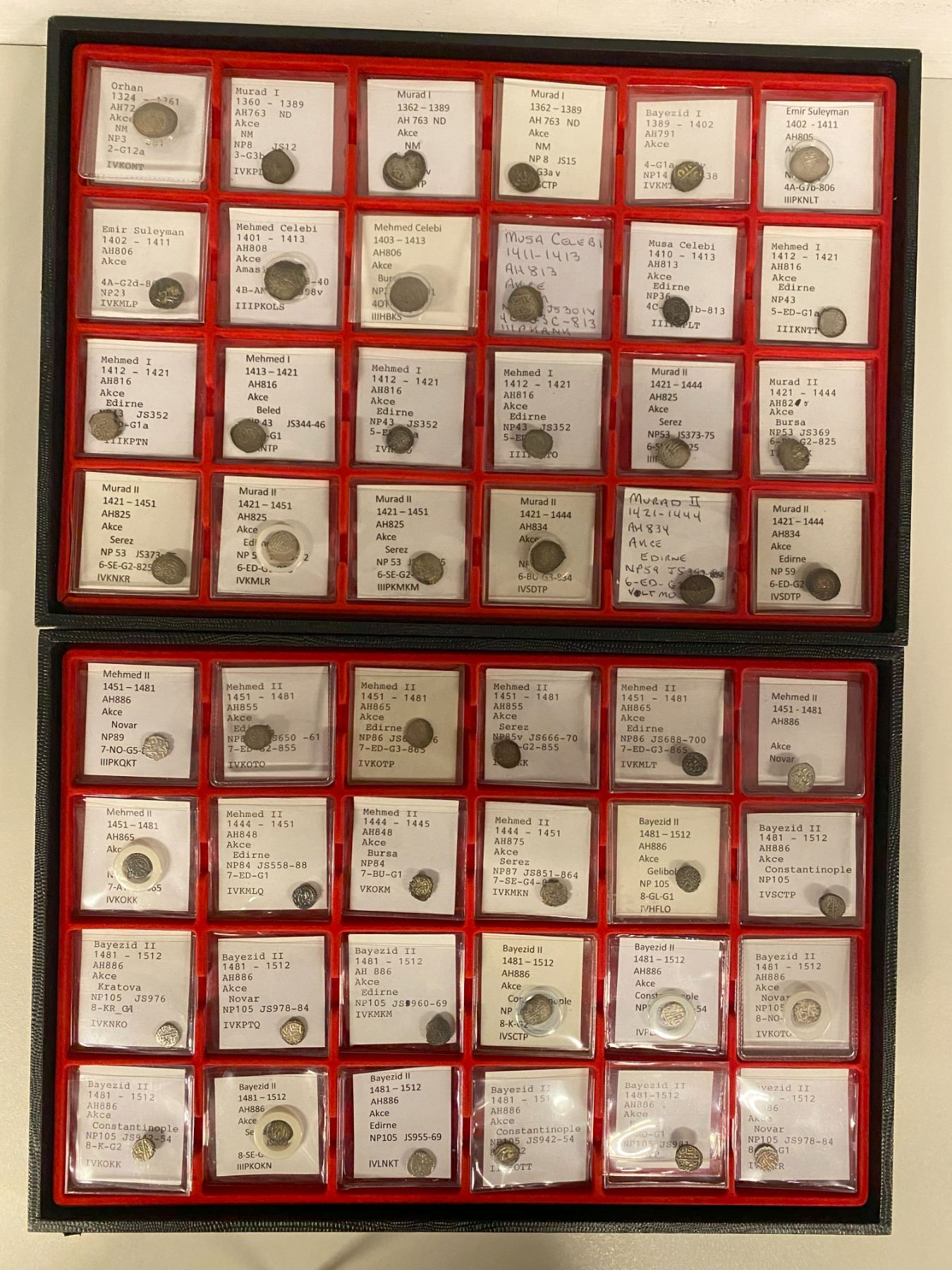OTTOMAN EMPIRE: LOT of 84 akçes and 4 larger coins, including Orhan (1 pc, weak strike), Murad I (3, low quality); Bayezit I (1), Emir Suleyman (2), Mehmet Çelebi (2), Musa Çelebi (2, one damaged), Mehmet I (5), Murad V (8), Mehmet II (10, incuding one of the scarce Novar AH886), Bayezit II (14), Selim I (7), Suleyman I (9), Murad III (3), Mehmet III (9, includng three of Filibe in inferior grades and one of Kastamonu poor strike), Ahmet I (2), Murad IV (2), Ibrahim (2), and Mehmet IV (1), plus 5 very common larger denominations of Amid, Canca, Halab, and mint off, all in average grades with much weakness; circulated grades, but most below average with considerable weakness or other flaws, with only a few of the very common types in better grades, viewing recommended; retail value $900, lot of 89 pieces. All identified by the consignor (not checked).