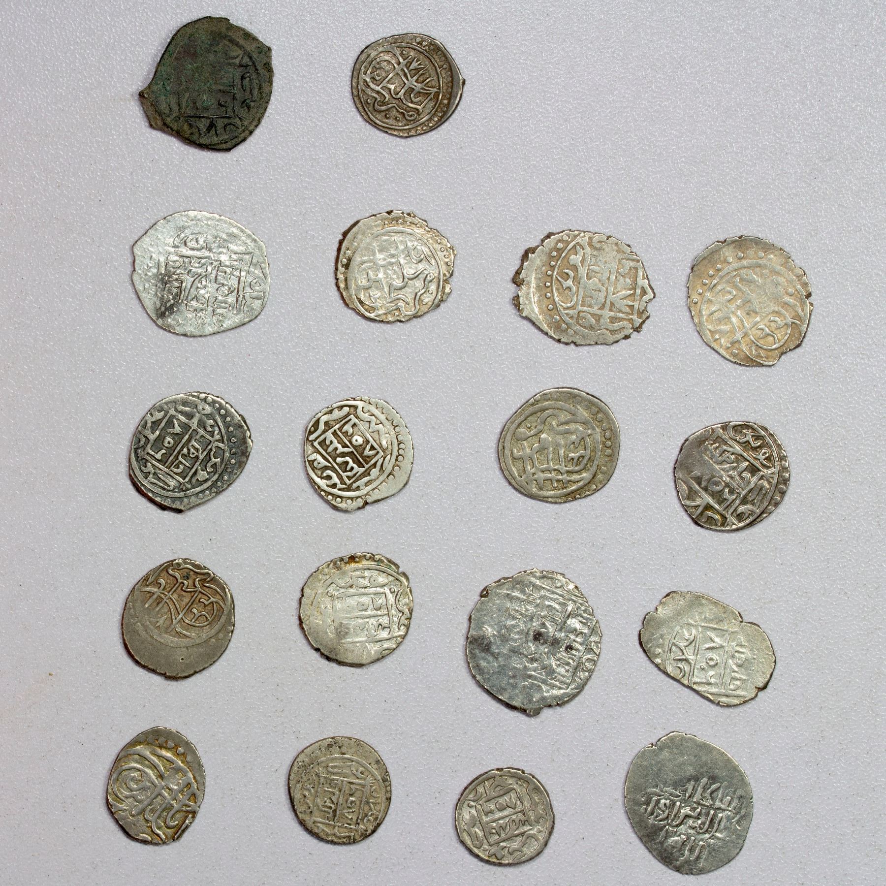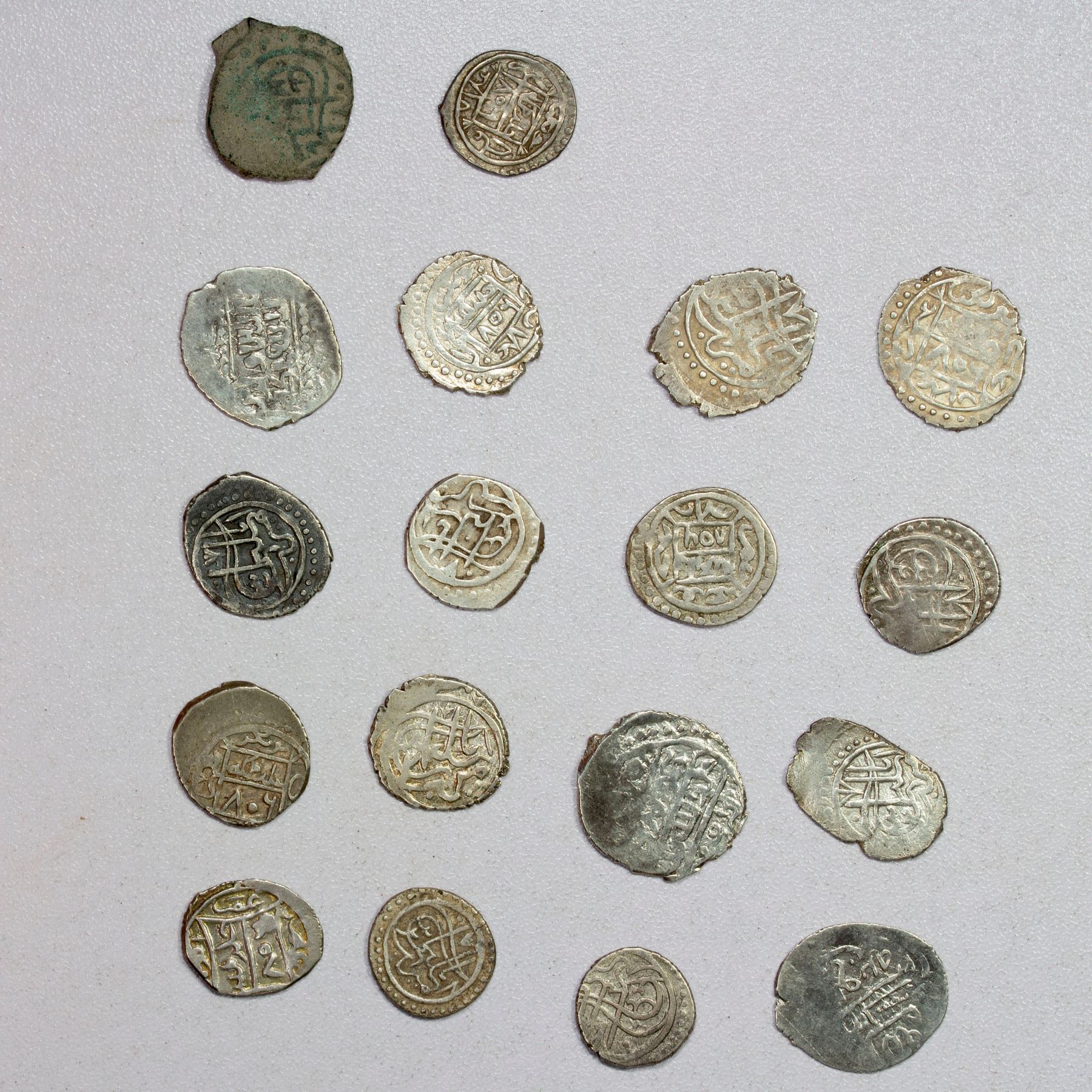 OTTOMAN EMPIRE: Süleyman Celebi, 1403-1410, LOT of 1 copper and 16 silver coins, types A-1296, AR akçe, no mint, AH806 (13), and A-1297, AE mangir, also no mint, AH806, plus type A-2384 in the name of Timur, mint of Amasya (3); most choice VF or better; retail value $300, lot of 17 pieces.