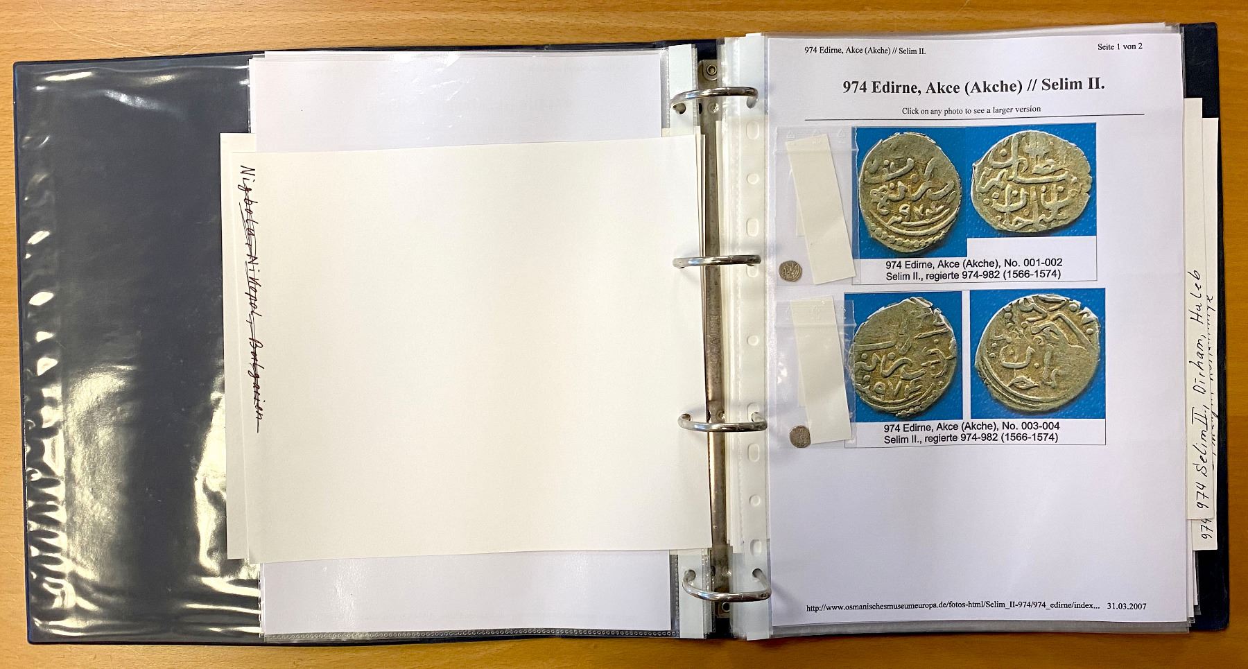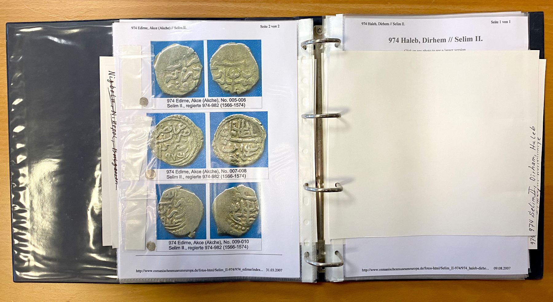 OTTOMAN EMPIRE: Selim II, 1566-1574, LOT of 42 silver & 2 copper coins, all are silver akçes (A-1328) unless otherwise noted: mints of Amid (1, dirhem), Belgrad (2), Dimashq (1, AE mangir), Edirne (5), Halab (1, dirhem), Kostantiniye (1, AE mangir), Kratova (9), Novaberda (12), Ohri (1, clear mint), Serbernice (2), Sidrekapsi (6), and Uskub (4); attribution by the consignor, mostly correct, viewing recommended; average circulated grades, some quite attractive; retail value $650, lot of 44 pieces. All coins in the consignor's original album together with his original enlarged photos of each coin.