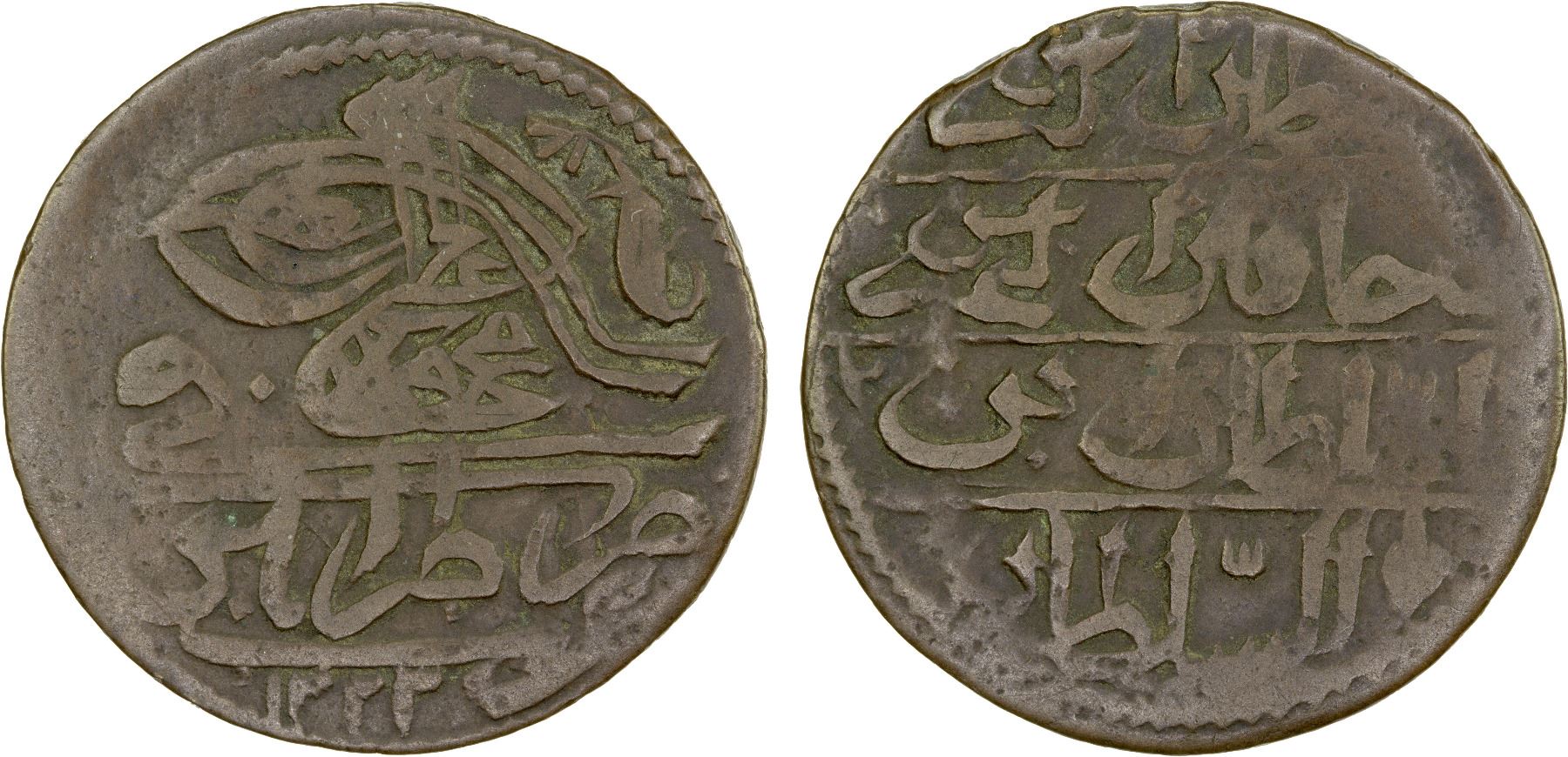 TRIPOLI: Mahmud II, 1808-1839, BI 40 para (10.79g), AH1223 year 20, KM-186.1, poorly struck as usual, Fine, ex Landon Thomas Collection; ex Künker Auction 210 Lot 1848, ex SARC Auction 23 Lot 335.