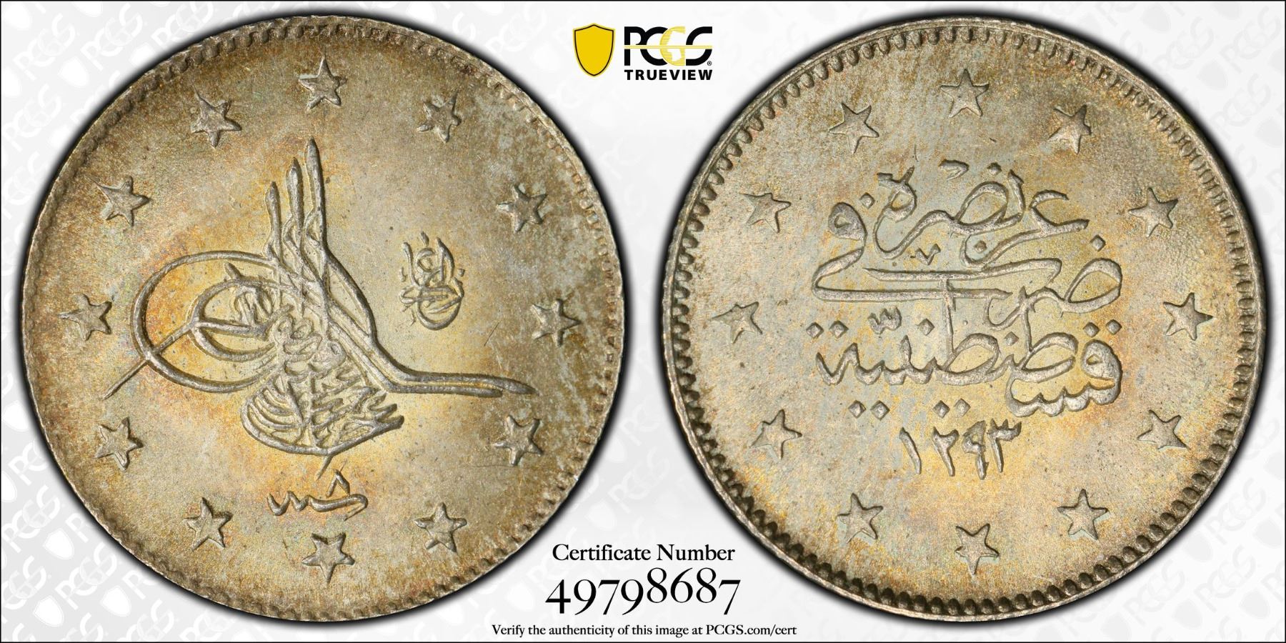 OTTOMAN: TURKEY: Abdul Hamid II, 1876-1909, AR 2 kurush, Kostantiniye, AH1293 year 8 (1883), PCGS MS