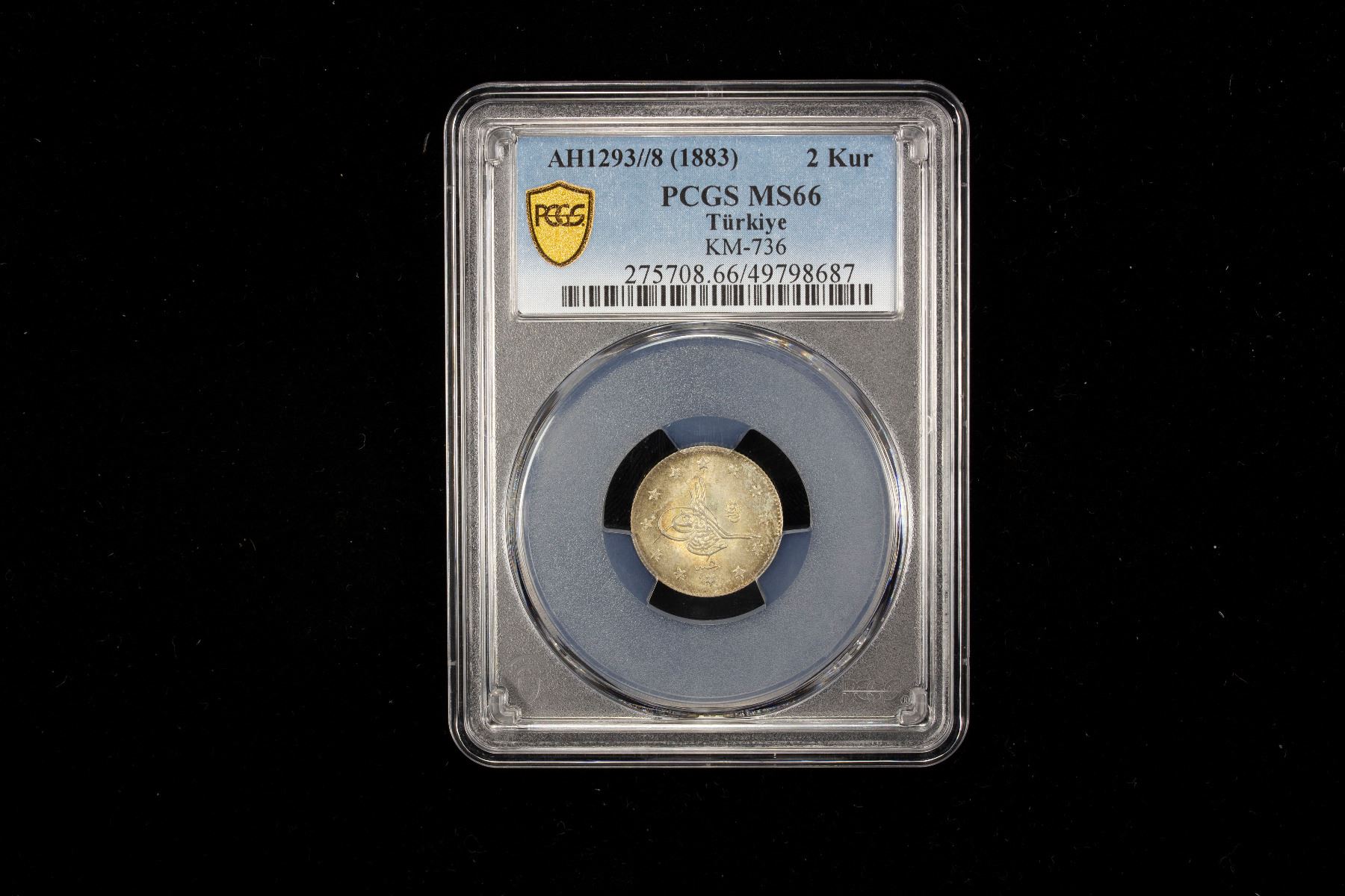 TURKEY: Abdul Hamid II, 1876-1909, AR 2 kurush, Kostantiniye, AH1293 year 8 (1883), KM-736, a fantastic reflective lightly toned mint state example! PCGS graded MS66. Part of a small group of 14 coins of this accessional date and regnal year purchased by Maj. Fred S. Pridmore in Cyprus in the 1960s.