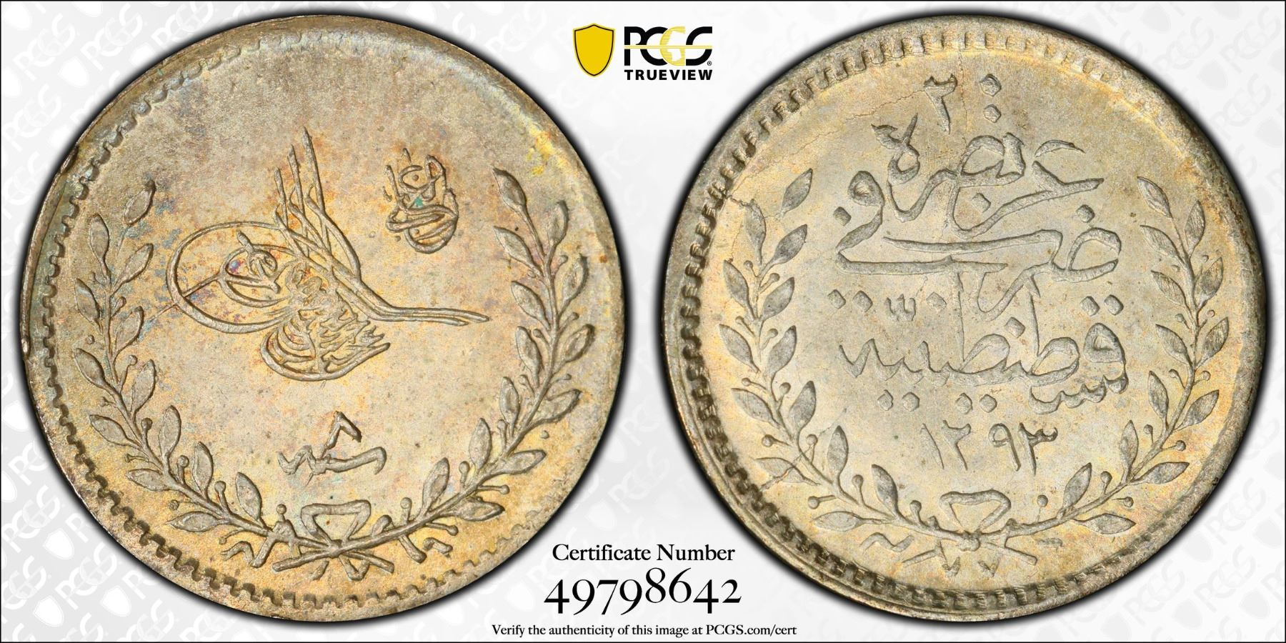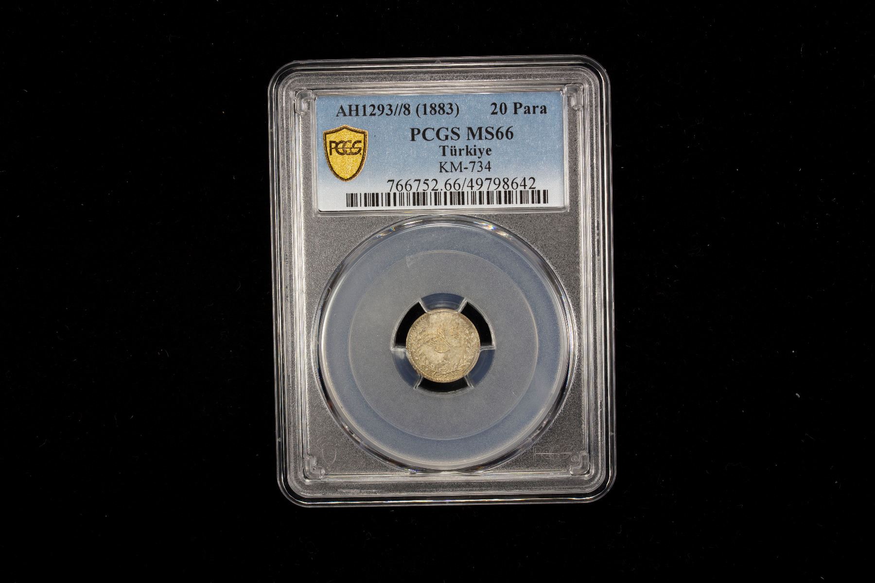 TURKEY: Abdul Hamid II, 1876-1909, AR 20 para, Kostantiniye, AH1293 year 8 (1883), KM-734, a fantastic lustrous mint state example! PCGS graded MS66. Part of a small group of 42 coins of this accessional date and regnal year purchased by Maj. Fred S. Pridmore in Cyprus in the 1960s.
