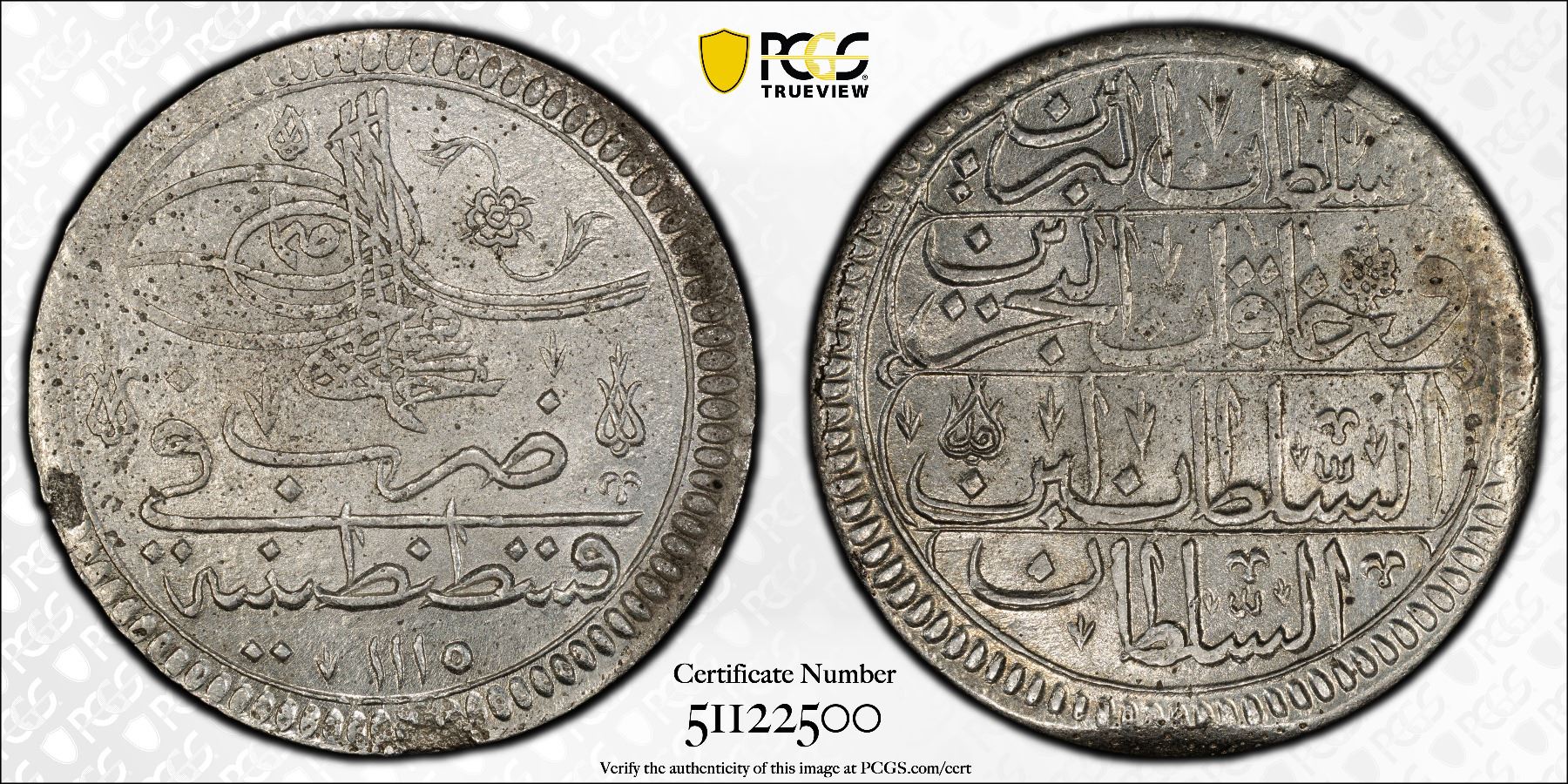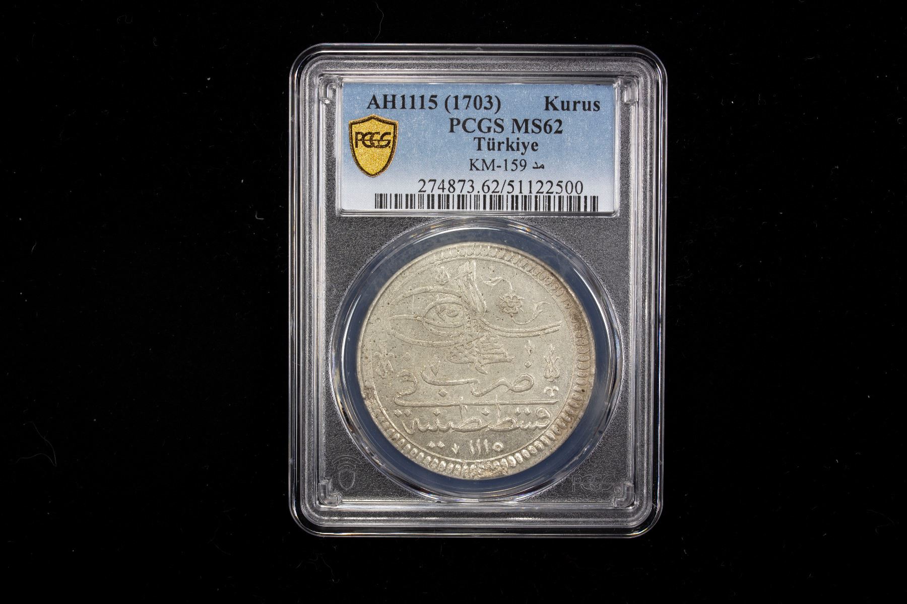 TURKEY: Ahmed III, 1703-1730, AR kurush, Kostantiniye, AH1115, KM-159, mint master initials mim dal, a pleasing lustrous mint state example, PCGS graded MS62.