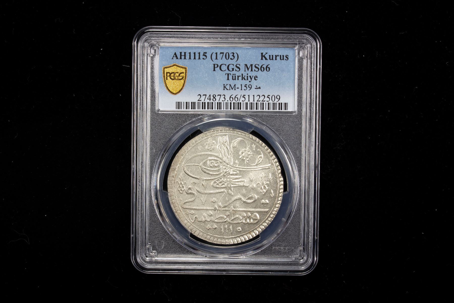 TURKEY: Ahmed III, 1703-1730, AR kurush, Kostantiniye, AH1115, KM-159, mint master initials mim dal, a fantastic lustrous mint state example! PCGS graded MS66.