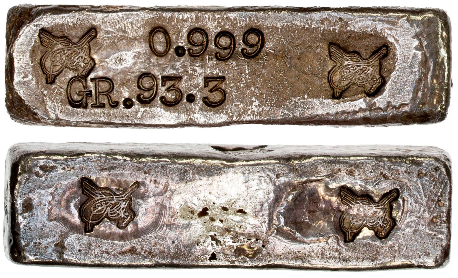 TURKEY: Anonymous, early 20th century, AR ingot (92.89g), ND, pure silver ingot, with fineness marked 0.999 and the weight GR.93.3 (actual weight is 92.98g), stamped with an uncertain toughra 8 times (twice on obverse & reverse and once on each of the 4 sides), XF, R.
