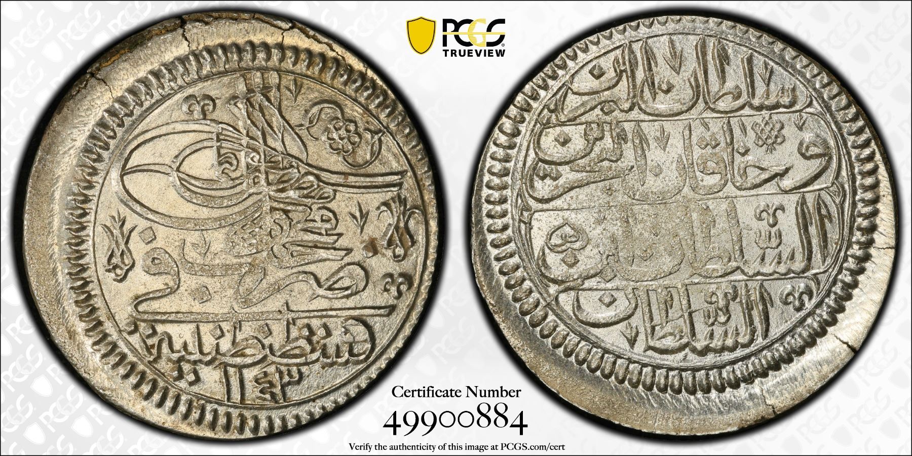 OTTOMAN TURKEY: Mahmud I, 1730-1754, AR yirmilik, Kostantiniye, AH1143 (1730), PCGS MS63