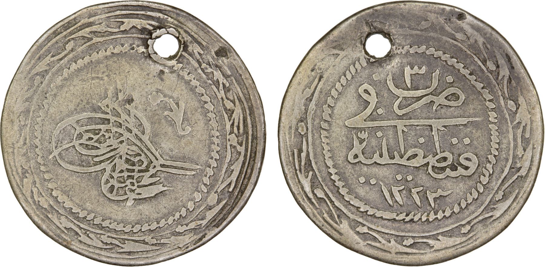 TURKEY: Mahmud II, 1808-1839, AR kurush (4.82g), Kostantiniye, AH1223 year 3, KM-562, 3rd monetary series, pierced, Fine, RR. The third monetary standard was struck simultaneously to the second standard, but differed in the fineness.730 silver instead of .465.