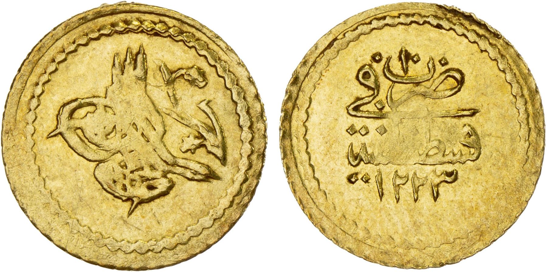 TURKEY: Mahmud II, 1808-1839, AV rubiye (0.78g), Kostantiniye, AH1223 year 10, KM-608, scarce date, lustrous, XF-AU, ex Ken Bovenkamp. The rubiye ("quarter") is 1/4 of the sultani (findik), which was struck to the standard of about 3.50g until reduced to 3.20g under Mustafa IV. Thus this rubiye is exactly 1/4 of the reduced sultani. It is not 1/4 of the zeri mahbub, which weighed about 2.60g, even though this classification has been almost universal in the KM and other catalogs. The rubiye may also be called 1/4 sultani, 1/4 findik, or 1/4 eshrefi (three more different terms for the same denomination).
